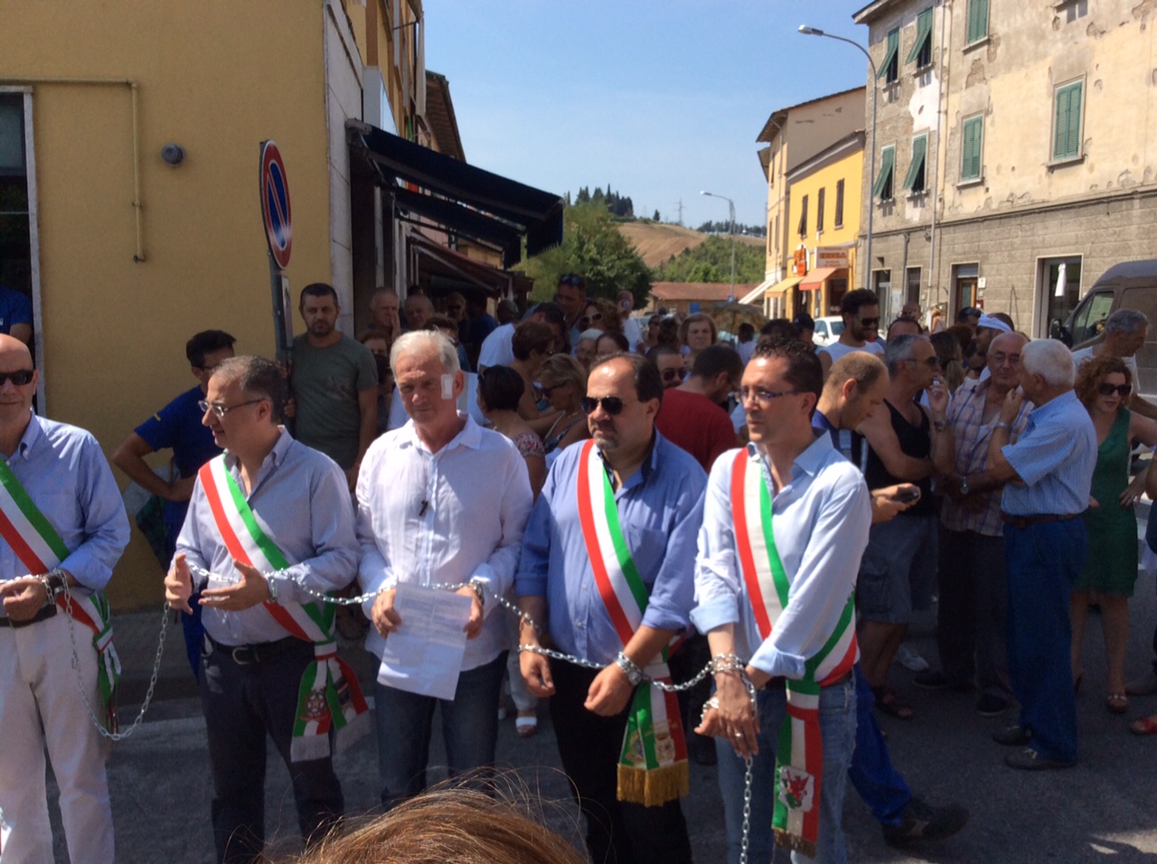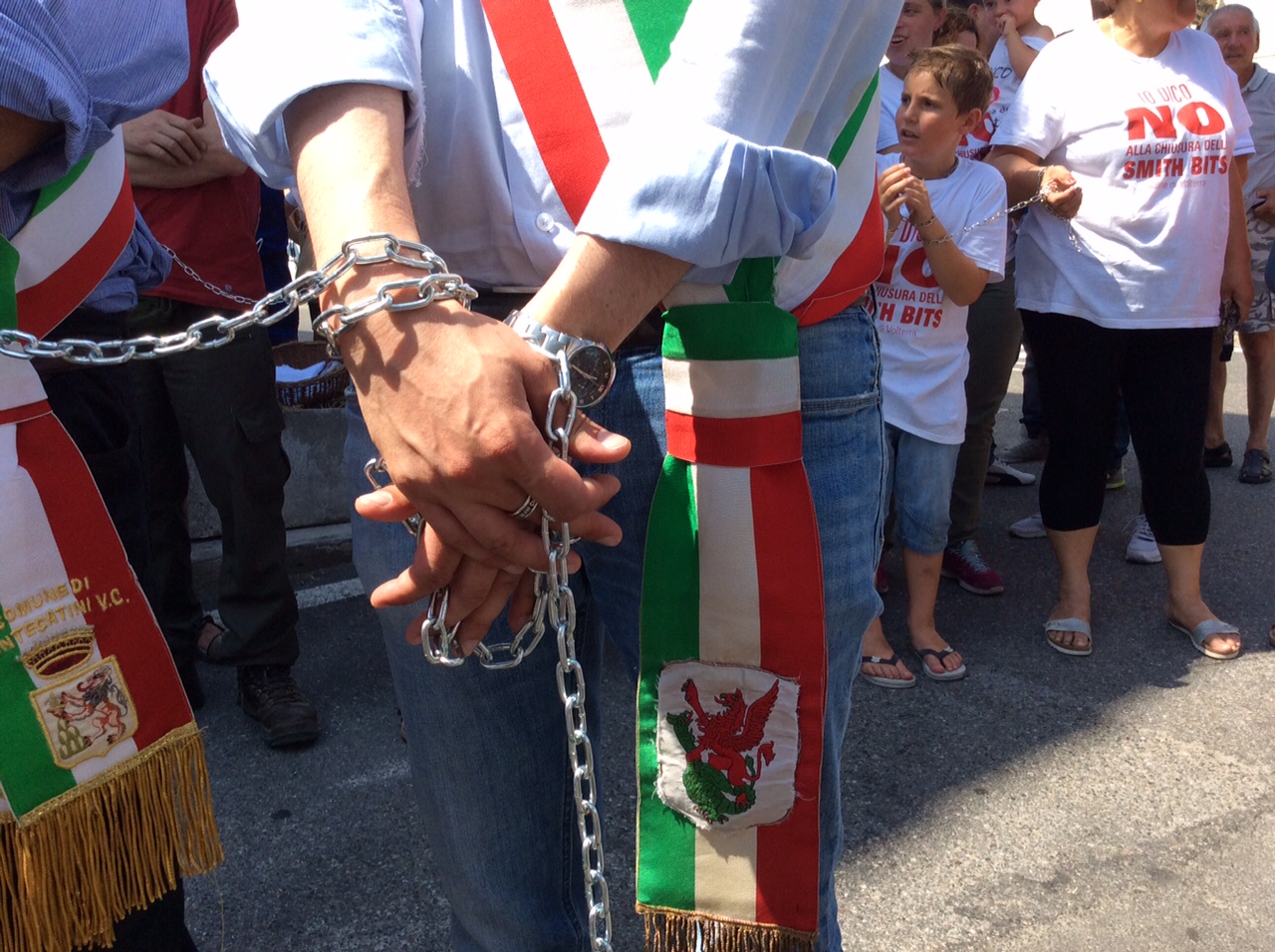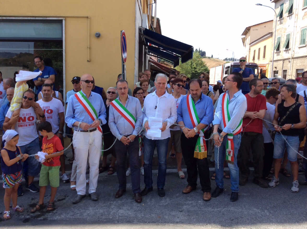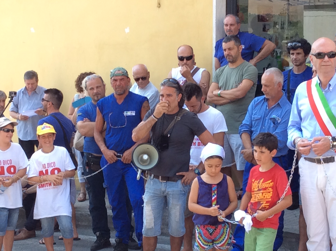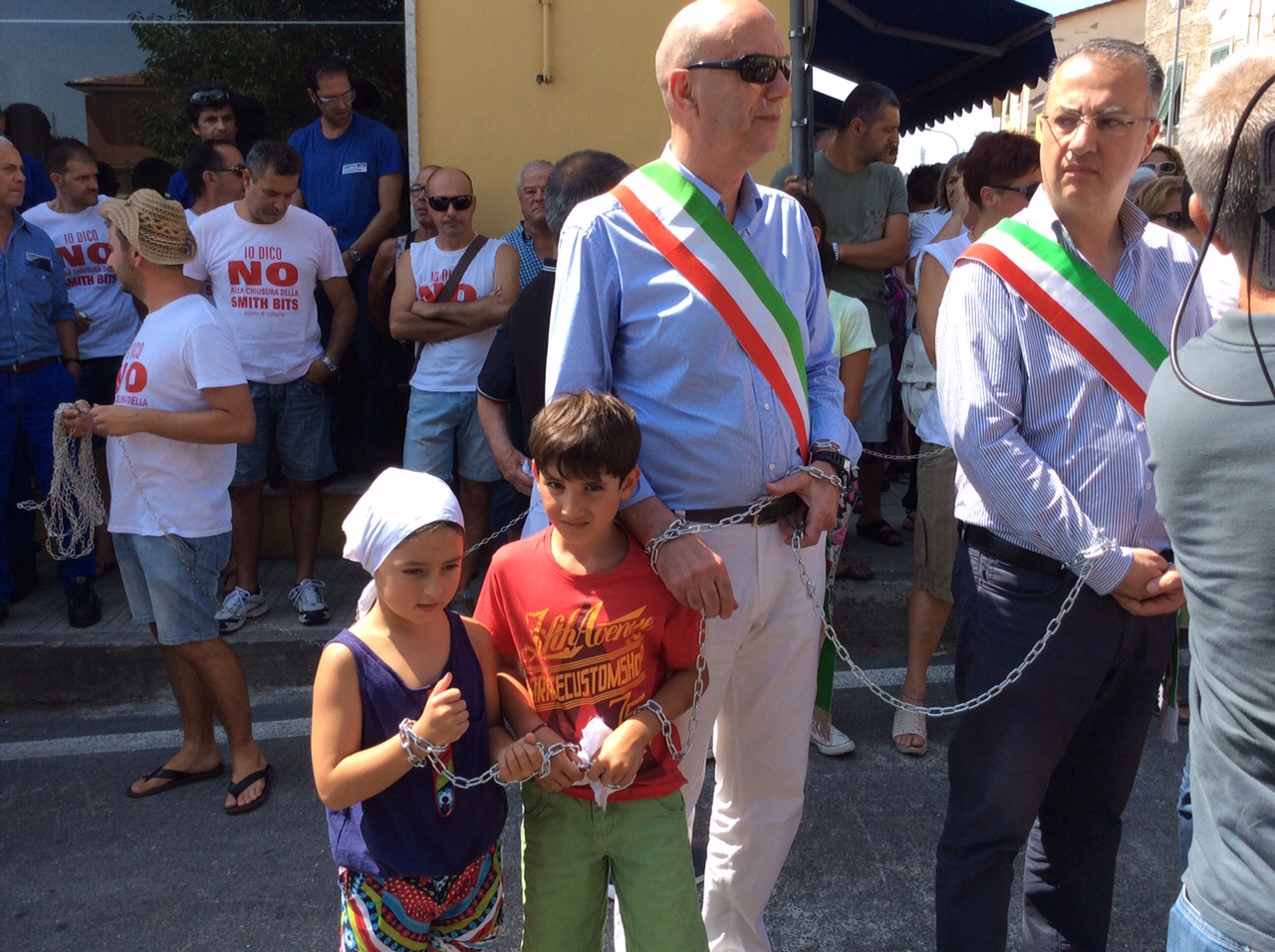 Si sono incatenati simbolicamente uno con l’altro formando una catena insieme ai cento operai che ancora oggi rischiano di non avere un futuro lavorativo alla Smith di Saline. I sindaci di Volterra (Marco Buselli), Pomarance (Loris Martignoni), Montecatini (Sandro Cerri), Castelnuovo Valdicecina (Alberto Ferrini) e Monteverdi Marittimo (Carlo Giannoni), hanno scelto la protesta clamorosa in attesa della convocazione del tavolo di concertazione annunciato dal presidente della Regione Toscana Enrico Rossi e che potrebbe aprire nuovi scenari occupazionali.
