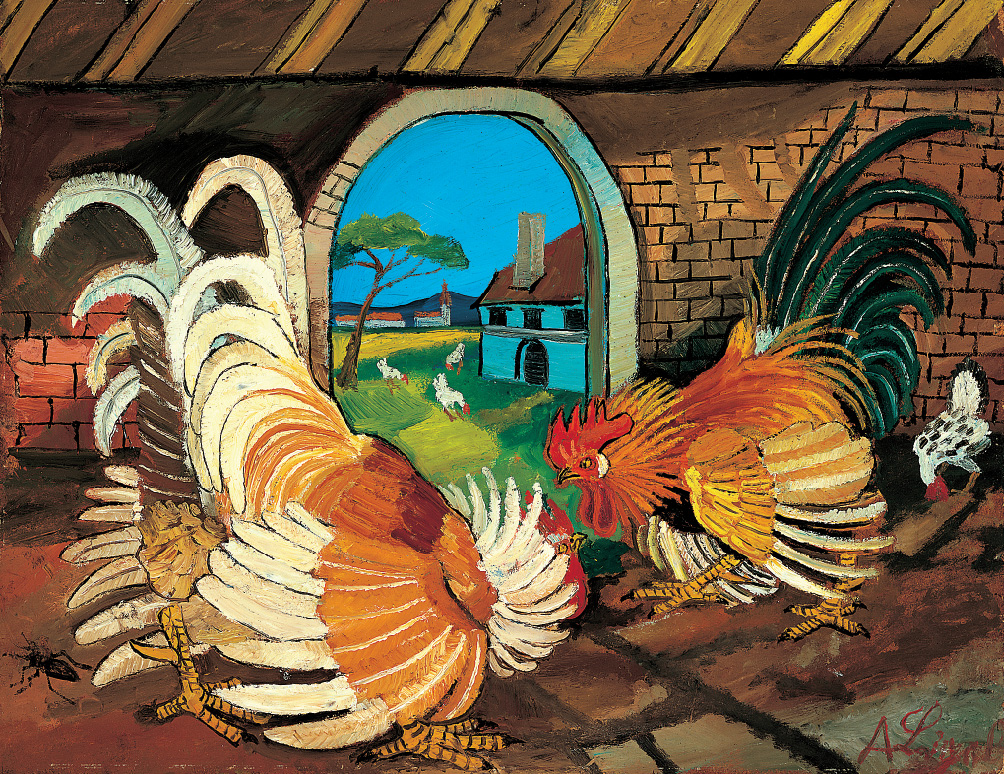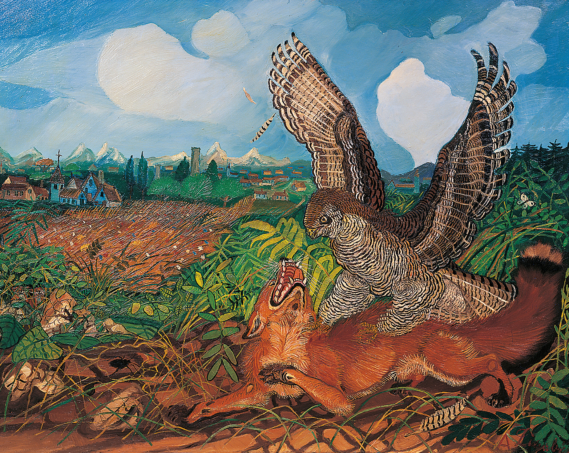 "Volpe con rapace", olio su tela. Luciano Ligabue