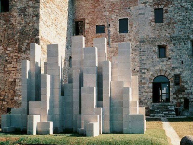 Dov’era, com’era. Sol Lewitt (Hartford 1928 – New York 2007) artista statunitense legato all’arte concettuale e minimalista, che aveva scelto l’Italia come seconda casa, aveva realizzato la scultura “Concrete Blocks” nel giardino del museo archeologico in via temporanea per l’edizione di Arte all’Arte del 1997, manifestazione curata dall’Associazione Arte Continua che in 10 anni ha portato i più grandi artisti internazionali a lavorare sul territorio della Valdelsa, al quale hanno lasciato una moltitudine di opere di arte pubblica, all’insegna del connubio arte-architettura-paesaggio.
