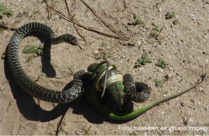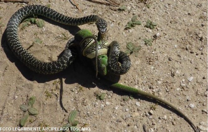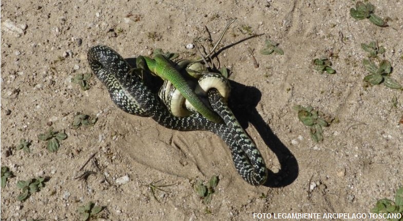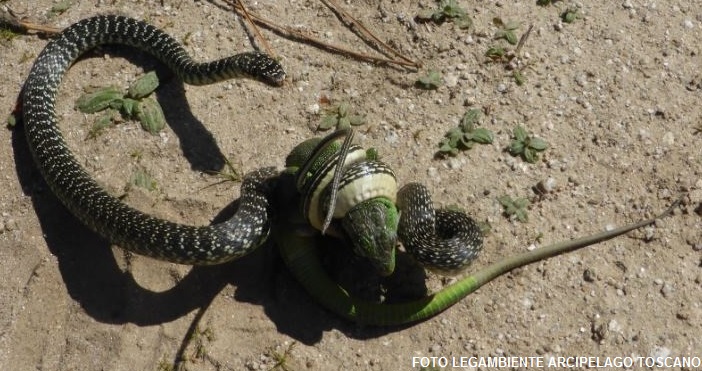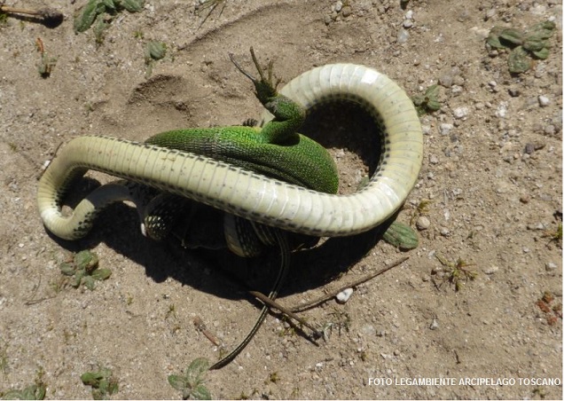 L’abbraccio mortale E’ l’eterna lotta per la vita tra un biacco (Hierophis viridiflavus) e un ramarro occidentale (Lacerta bilineata), con il sauro che cercava di resistere alla stratta del serpente che, per soffocarlo con più forza si mordeva il corpo. A scoprirli due addetti di Legambiente. La lotta tra i due animali non si è interrotta nemmeno quando uno dei due uomini ha scoperto i due rettili mortalmente abbracciati, mentre l’altro ha cominciato a scattare foto. Solo dopo un po’, quando il ramarro ha cominciato a districarsi dalle faticosamente dalle spire che lo stavano soffocando, il biacco si è accorto degli umani ed ha tentato di mordere il fotografo. Cosa che ha consentito al ramarro di liberarsi un altro po’ ed alla fine il biacco ha lasciato la preda ed è strisciato nella bassa gariga, mentre il grosso ramarro, stordito ed evidentemente malconcio, è andato dalla parte opposta, passando caracollando lentamente tra le gambe del fotografo, ed ha guadagnato un più sicuro muretto a secco.