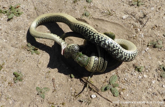 Una stretta che poteva essere mortale, uno strano serpente “annodato”, con due code. Non è la scena di un film horror ma lo straordinario spettacolo della natura che qualche giorno fa ha avuto per palcoscenico una delle aree più frequentate del Parco nazionale dell’Arcipelago Toscano, la strada di Piane al Canale.