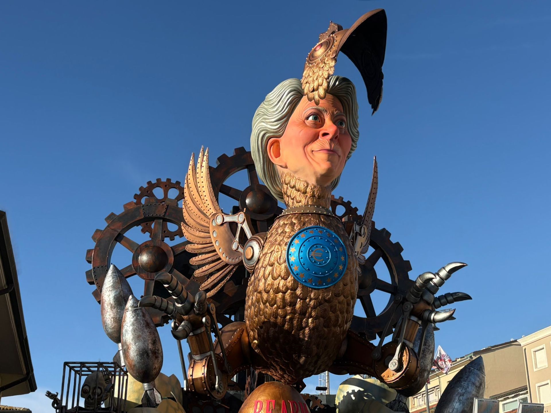 La gallina dalle uova d’oro, nata dalla creatività di Alessandro Avanzini, è un carro di satira contro il re-arm e la politica di Ursula Von der Leyen.