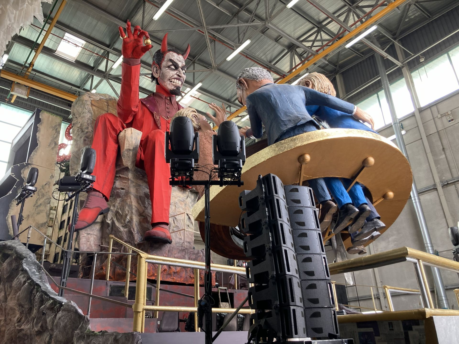 “Questi personaggi – spiega Elodie Lebigre – sono seduti a un tavolo da gioco in un casinò, circondato da macerie che possono essere quelle di Gaza o dell’Ucraina. Sulla facciata di questi palazzi distrutti, abbiamo riprodotto alcuni articoli della Dichiarazione universale dei diritti umani del 1948, stracciata da questi leader mondiali che fanno accordi sottobanco per i propri interessi personali e non delle proprie comunità. Si credono grandi, ma come uomini e donne sono miserevoli: perciò li abbiamo realizzati con teste grandi e corpi piccini”. Del resto – prosegue l’artista – questi personaggi ritengono “di comandare il mondo, ma non si accorgono che il gioco è in mano al Diavolo-croupier, una spia ulteriore del fatto che il banco vince sempre. E loro perdono. O, meglio, fanno perdere noi, essere umani. Lo sottolineiamo nel carro con le slot machine che girano impazzite, alternando le facce di questi leader a quelli delle bombe. O con le figuranti vestite a lutto per i morti delle guerre ma che, a un certo punto, si tolgono velette e mostrano i veri abiti: quelli da diavolo”.