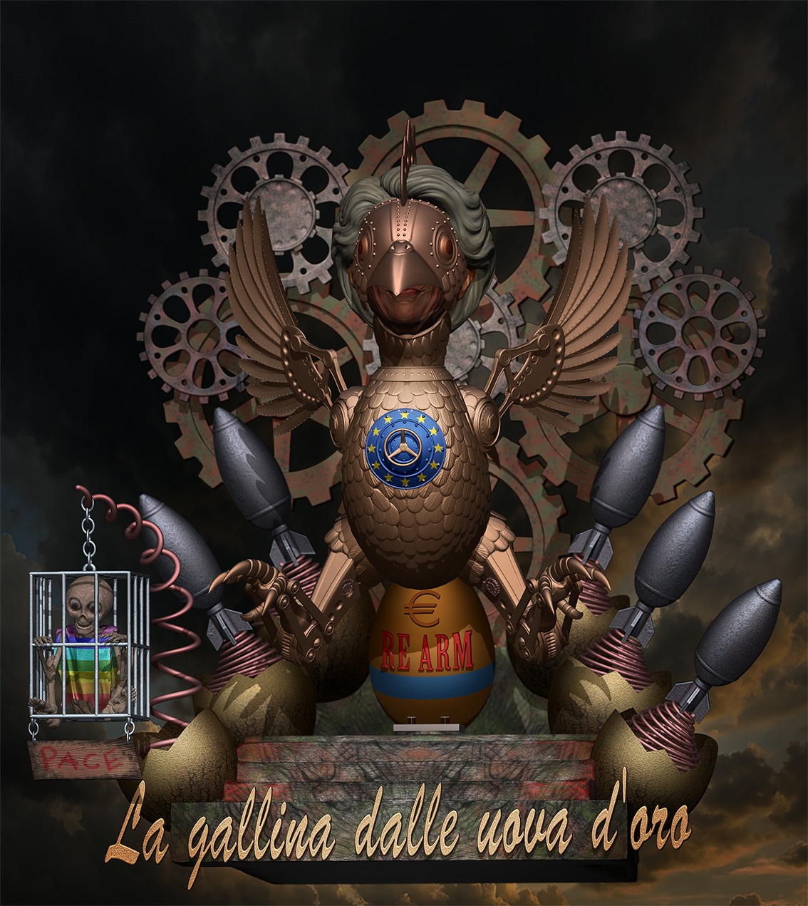 Chissà se queste immagini, se la satira di Viareggio quest’anno arriverà nei palazzi del potere internazionale. Di certo, personaggi e messaggi sono riconoscibili. Gli attacchi pure. Alessandro Avanzini trasforma Ursula von der Leyen in una robotica gallina dalle uova d’oro (La gallina dalle uova d’oro è, infatti, il titolo del carro). “Tuttavia – precisa il costruttore – la presidente dell’Unione europea-gallina non produce uova: dal suo corpo escono bombe. É una portatrice di morte, non di vita. Questo progetto mi è venuto in mente la scorsa primavera quando la presidente Von der Leyen autorizzò il riarmo dell’Europa, senza passare dal Parlamento, confermando che la politica è asservita alle grandi lobby della guerra e della produzione delle armi. Non è più l’Europa l’Europa nata dai valori di solidarietà, uguaglianza, tutela dei diritti ma è ormai un’Europa che sta producendo di nuovo ciò che la distruggerà: i nazionalismi. Mentre la pace ormai è diventata un’eresia. E, come gli eretici, sta chiusa in una gabbia medievale”.