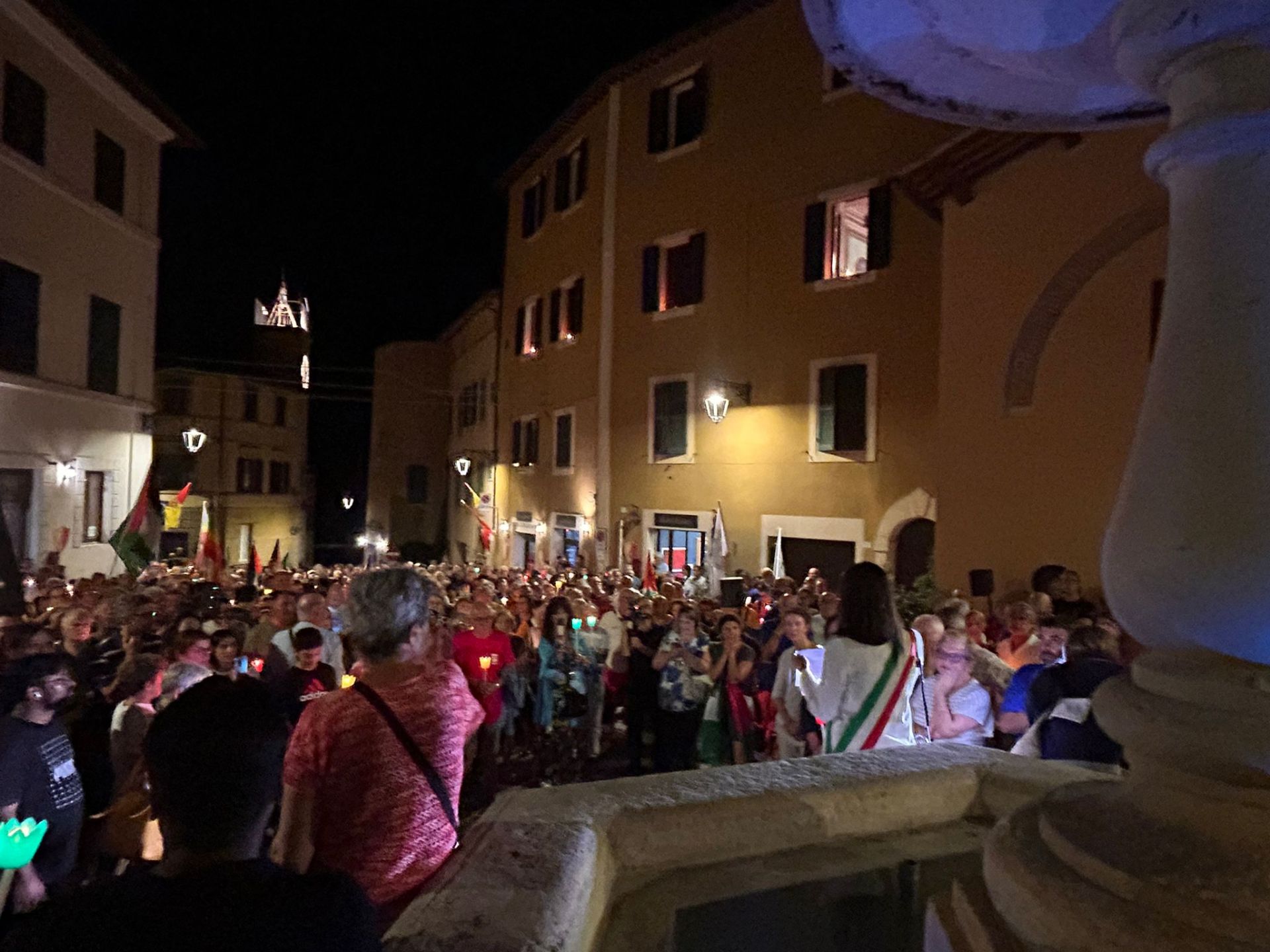 “Una marcia silenziosa, ma forte. La lettura di testimonianze e poesie palestinesi ha accompagnato il significato della Fiaccolata. Nessun nemico, non si è marciato contro qualcuno, ma per risvegliare le nostre coscienze di fronte al genocidio in atto nella Striscia di Gaza, dalla parte delle vittime civili, bambini e bambine, donne e uomini, un popolo che viene annientato dalla fame, usato come arma di guerra, a cui si vuole togliere dignità di essere cittadini nella loro stessa terra” ha aggiunto la consigliera con delega alla pace Clori Bombagli.