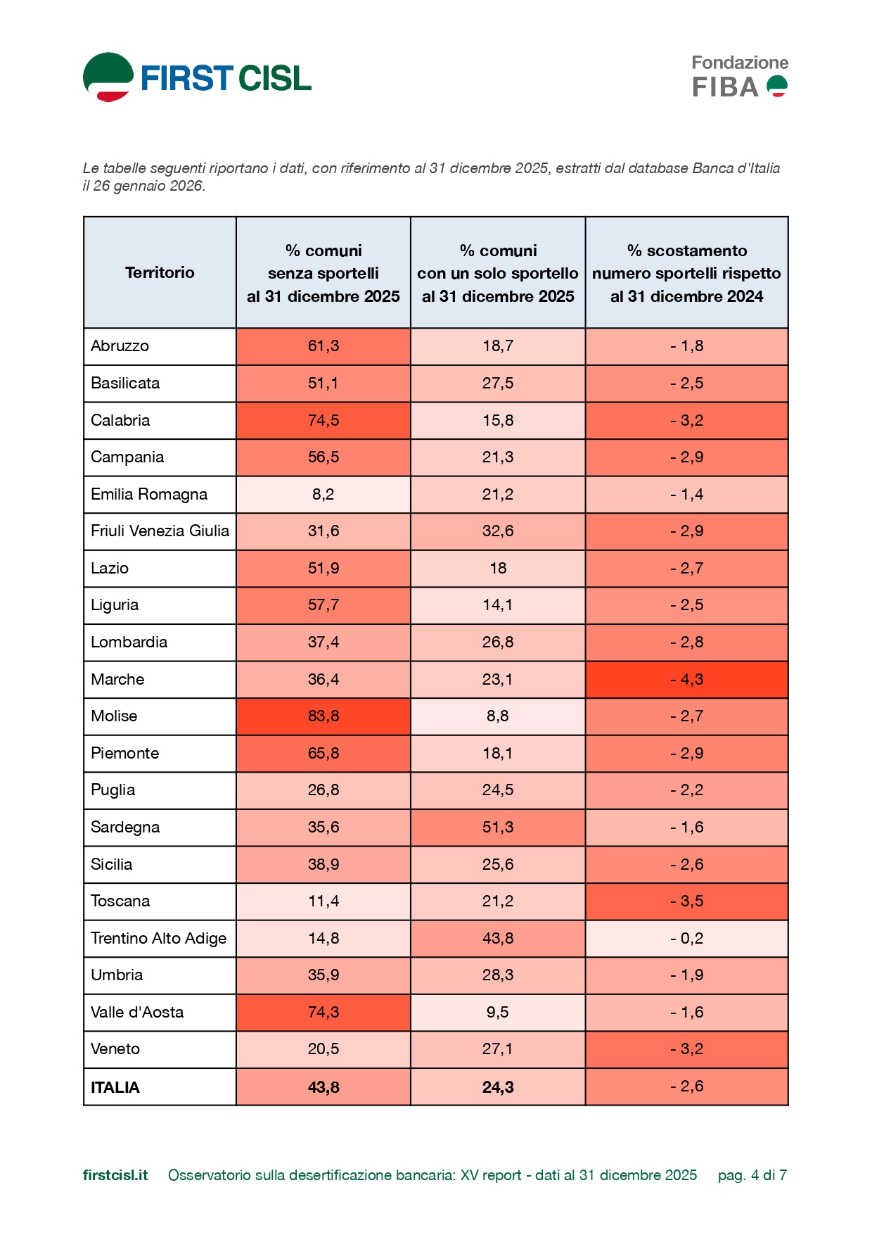 È quanto emerge dall’aggiornamento dell’Osservatorio sulla desertificazione bancaria della Fondazione Fiba di First Cisl, che elabora i dati resi disponibili da Banca d’Italia e Istat. Anche nel 2025 i tagli alla rete fisica non hanno interessato in modo omogeneo le diverse aree del Paese, confermando forti squilibri territoriali.