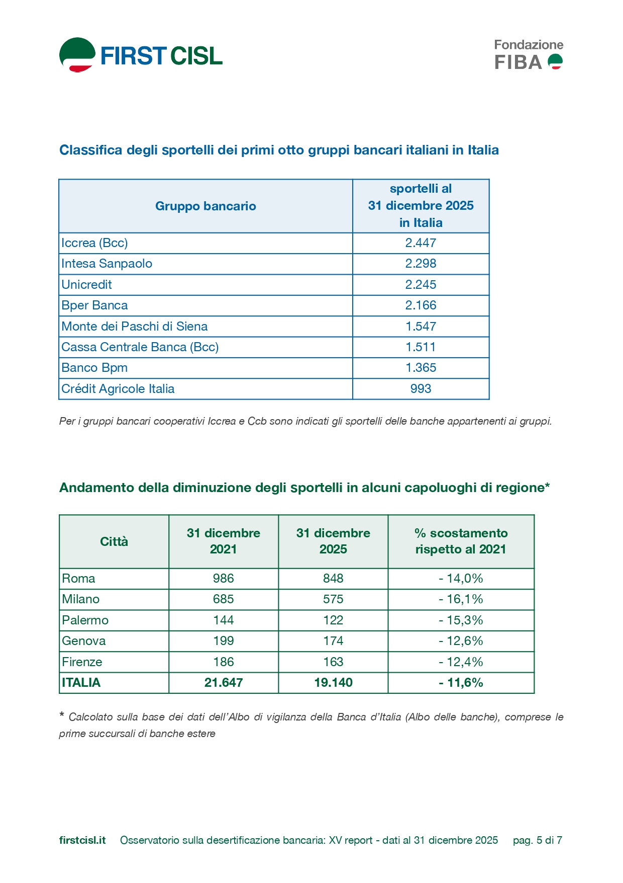 La desertificazione bancaria non colpisce solo le aree interne. Al contrario, se si guarda all’evoluzione del fenomeno, si nota che dalla fine del 2021 al 31 dicembre 2025 la percentuale di chiusure nelle due più grandi città italiane, Roma (- 14%) e Milano (-6,1%), è superiore alla media nazionale (- 11,6%).