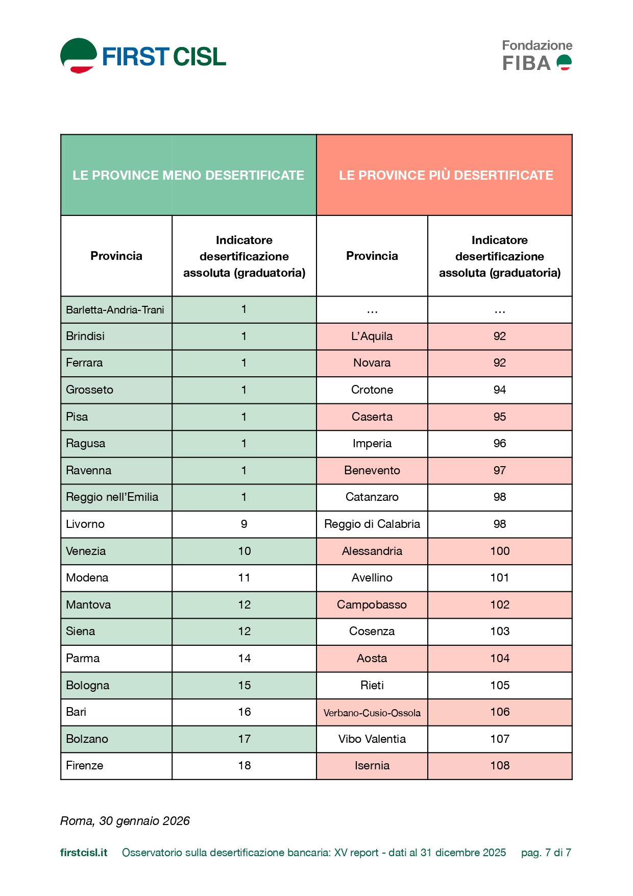 L’Osservatorio sulla desertificazione bancaria della Fondazione Fiba di First Cisl elabora anche un indicatore (Ipd, Indicatore di desertificazione provinciale) che assegna ad ogni provincia italiana un punteggio sulla base della percentuale, calcolata sui rispettivi totali, del numero di comuni senza sportello o con uno sportello, della popolazione residente, delle imprese con sede legale in detti comuni e della relativa superficie. La graduatoria che emerge vede a settembre 2025 tra le province meno desertificate la conferma di Barletta-Andria-Trani, Brindisi, Ferrara, Grosseto, Pisa, Ragusa, Ravenna, Reggio Emilia. Le grandi città si collocano in posizioni più arretrate: Milano è 23°, Roma 37°, Napoli 50°.