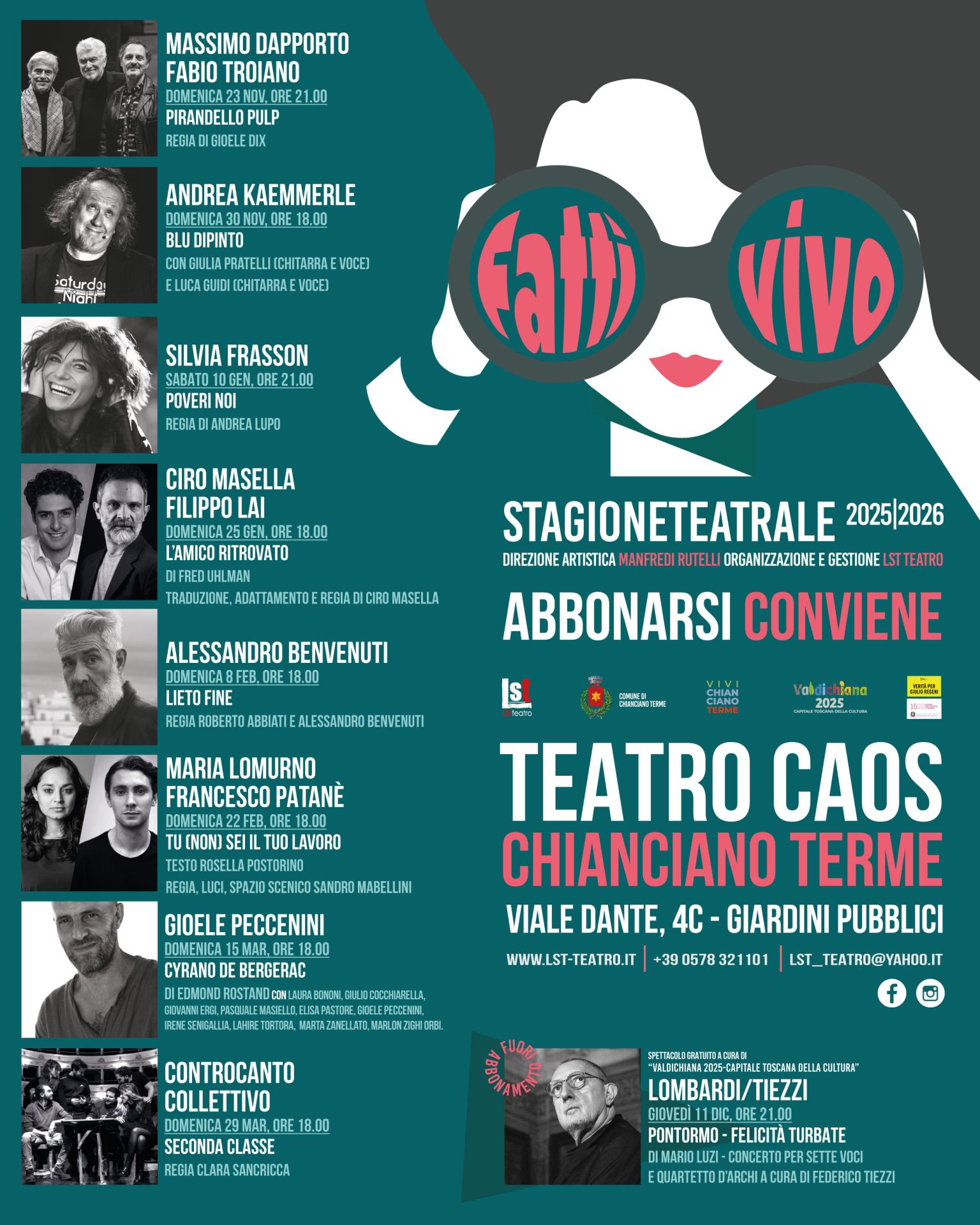 Il cartellone La stagione si apre il 23 novembre 2025 alle ore 21:00 con “Pirandello Pulp” di Edoardo Erba, regia di Gioele Dix, con Massimo Dapporto e Fabio Troiano. Una rilettura moderna e irriverente de “Il Giuoco delle Parti” di Pirandello, ambientata in un contesto pulp tra comicità, riflessione e metateatro. A precedere lo spettacolo, alle ore 18:15, un aperitivo gratuito con i protagonisti al Ridotto del Teatro Caos, offerto da Walter Papini Lounge Bar.