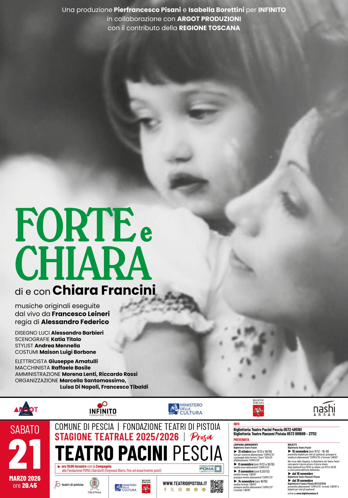 PESCIA (PT) – Al Teatro Pacini di Pescia, sabato 21 marzo (ore 20.45), la Stagione di Prosa 2025/26, promossa dall’Amministrazione Comunale con Fondazione Teatri di Pistoia, prosegue con FORTE E CHIARA, che vede in scena un volto popolare del teatro, cinema e tv, Chiara Francini, per la regia di Alessandro Federico.