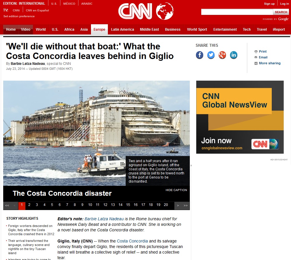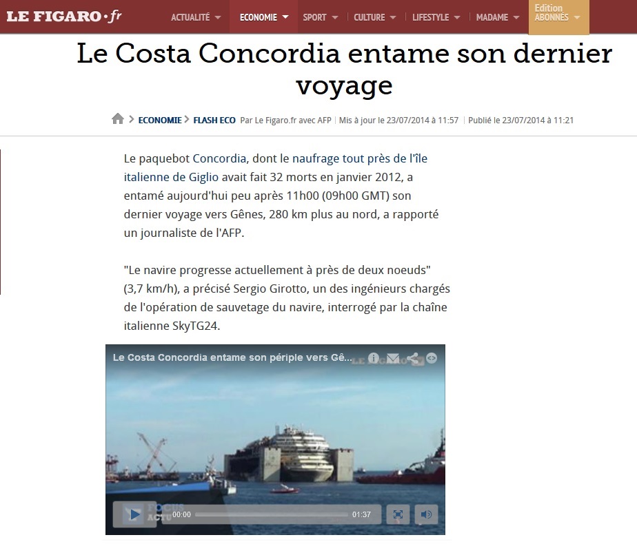 «El crucero vuelve a flotar». «La nave da crociera ha iniziato la sua navigazione titola lo spagnolo El Pays. «La Concordia entame son dernier voyage», «inizia il suo ultimo viaggio», risponde il francese Le Figaro. È un’altra giornata storica per l’Isola del Giglio, un altro momento in cui tutti gli occhi del mondo sono puntati su quello che sta succedendo nelle sue acque, con il relitto della Concordia che compie il suo ultimo viaggio e saluta, dopo 30 mesi, l’Arcipelago toscano. Per sempre. I titoli dei quotidiani online di riferimento in Spagna (leggi) e in Francia (leggi), si uniscono alle testate più prestigiose di tutto il mondo.