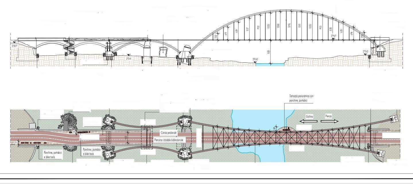 L’opera, finanziata con un contributo straordinario di 13 milioni di euro riconosciuto alla Provincia di Siena dalla Regione Toscana è stata inserita nel Piano Triennale delle opere pubbliche 2025-2027 con decreto della Presidente Agnese Carletti nel novembre 2024. Il ponte, situato al confine tra i Comuni di Castiglione d’Orcia e Pienza, rappresenta un’infrastruttura essenziale della SP 18/E, strada extraurbana secondaria che collega Pienza alla SS 2 Cassia in località Gallina, e costituisce un elemento di grande valore storico, paesaggistico e turistico della Val d’Orcia. L’idea progettuale prevede la realizzazione del nuovo ponte stradale (lunghezza 140 mt e larghezza 14 mt) e di una passerella ciclopedonale (lunghezza 100 mt e larghezza 4 mt). Dall’analisi e confronto delle alternative progettuali, sia per quanto riguarda la nuova passerella ciclopedonale che per il nuovo ponte stradale, sono state individuate le alternative “vincenti” rispettivamente per il ponte e la passerella.