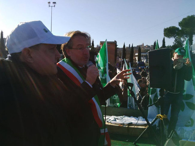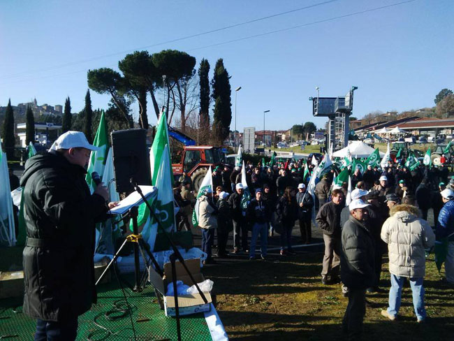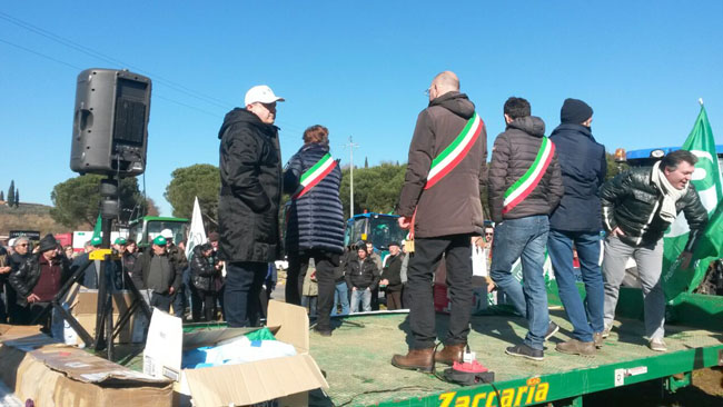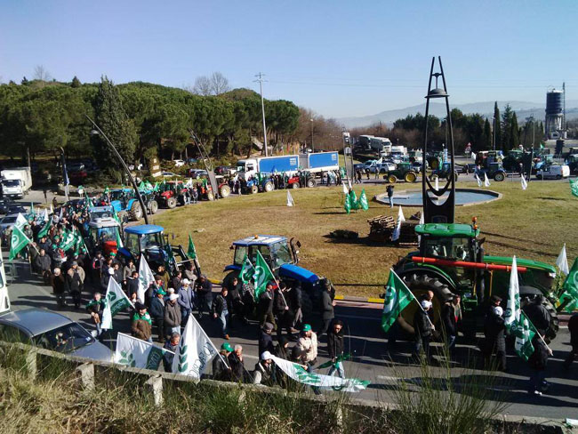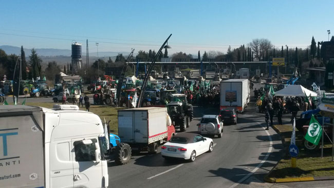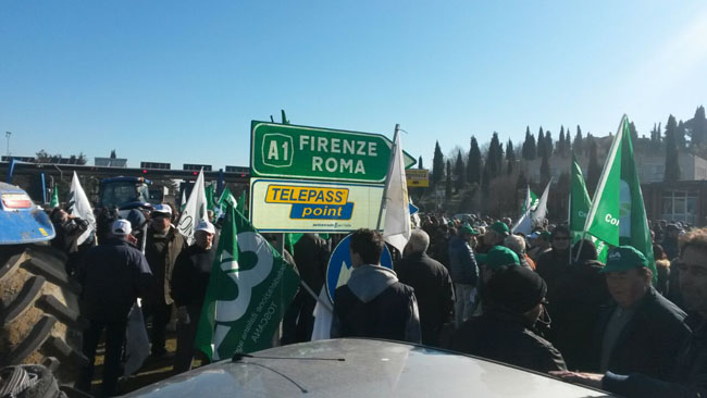 Oltre 500 agricoltori hanno manifestato questa mattina al casello Valdichiana sulla A/1 per dire no all’Imu sui terreni. Il presidio, promosso da Agrinsieme (Cia, Confagricoltura e Alleanza delle Cooperative Italiane), si è svolto pacificamente creando solo qualche rallentamento alla circolazione. In strada anche 50 trattori e qualche asino. Al presidio hanno partecipato anche alcuni sindaci del territorio senese e aretino. L’obiettivo è quello di sensibilizzare le istituzioni e la politica per una modifica correttiva in tempi rapidi da parte del Governo all’Imu sui terreni agricoli che Agrinsieme ritiene «iniqua e non sostenibile».