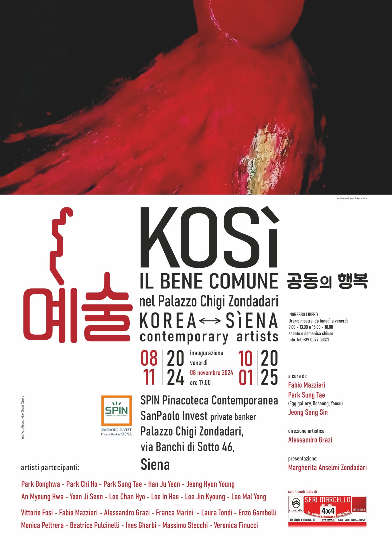 SIENA – Venerdì 8 Novembre alle ore 17.00 si inaugura “KOSì il bene comune”, la terza mostra nel tempo tra artisti della Korea e di Siena, presso SPIN pinacoteca contemporanea c/o SanPaolo Invest private banker nel Palazzo Chigi Zondadari via Banchi di Sotto 46 a Siena.