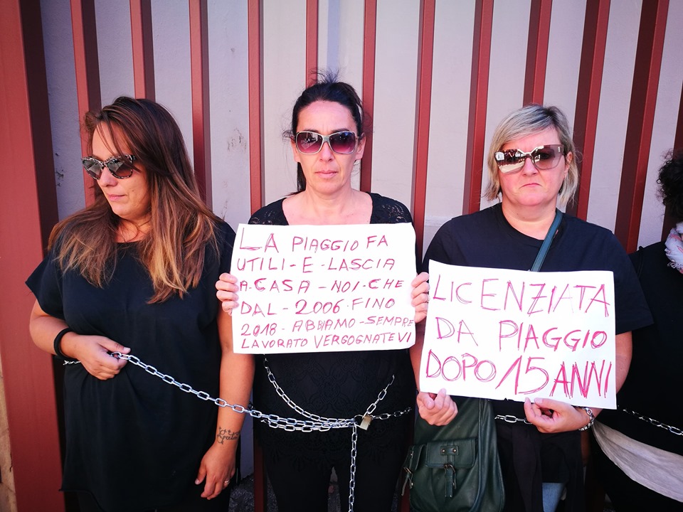 Mattinata di protesta per alcuni ex lavoratori della Piaggio di Pontedera che questa mattina si sono simbolicamente incatenati ai cancelli della sede pisana di Confindustria.