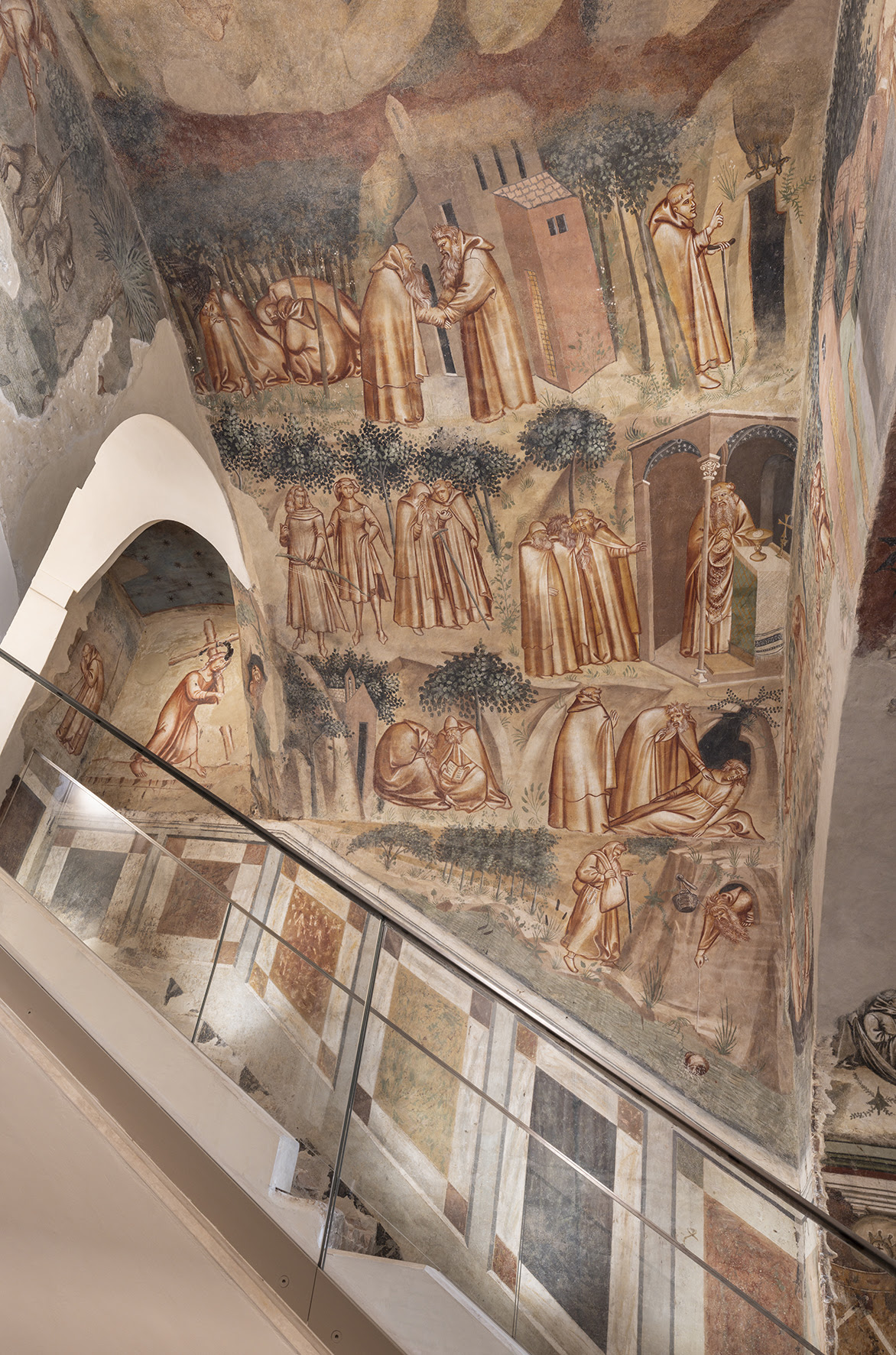 Era il 1999 quando, durante i lavori di recupero dell’Ospedale condotti dall’architetto Guido Canali, vennero scoperte le prime tracce di questi mirabili dipinti murali raffiguranti Storie di monaci ed eremiti, realizzati in prevalenza a monocromo in ocra rossa.