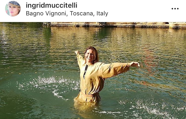 Sorridente ed entusiasta Ingrid Muccitelli, la conduttrice di Linea Verde, nella vasca Bagno Vignoni, per le riprese dello storico programma di Rai 1.