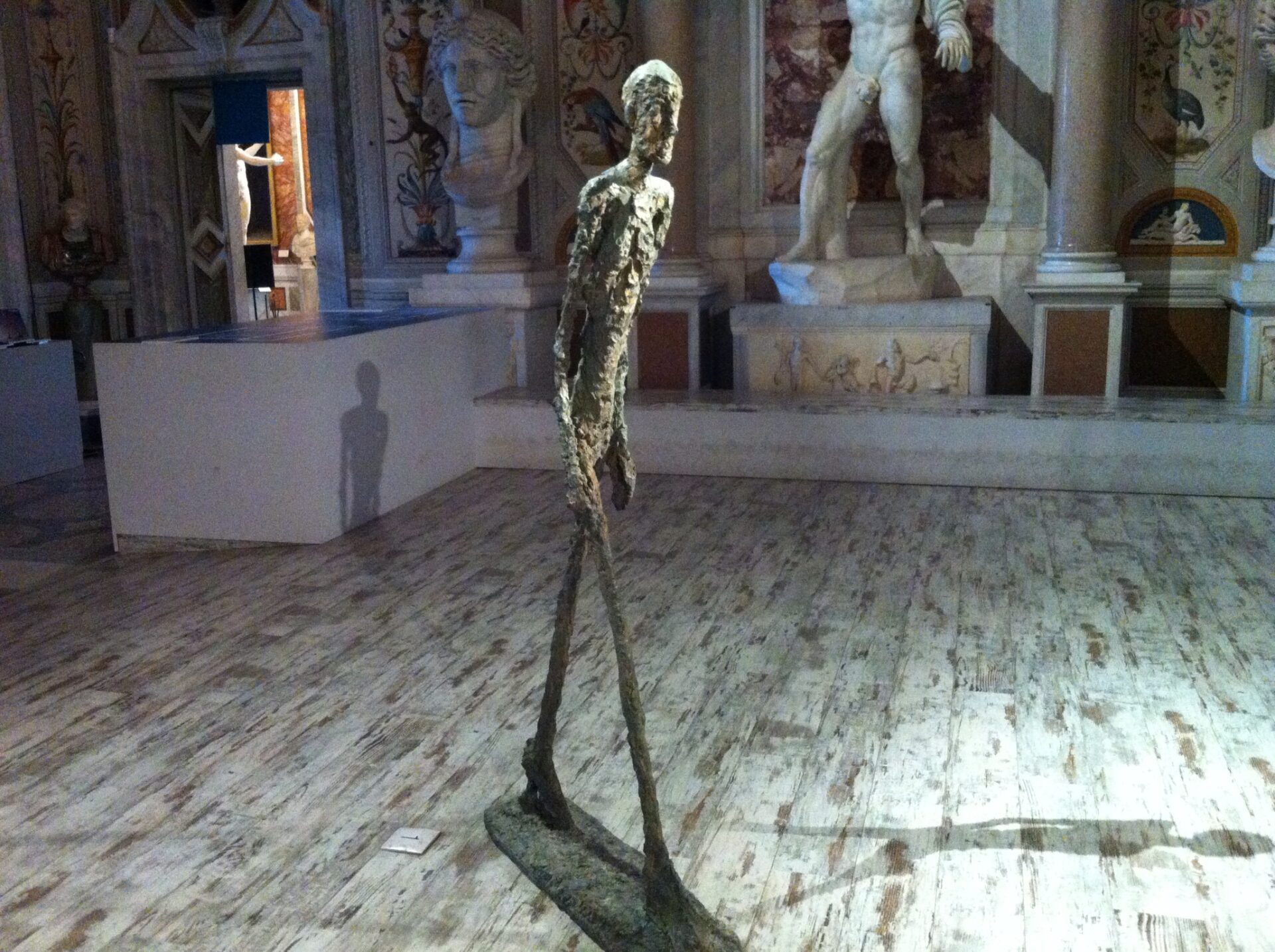 L’uomo che cammina di Giacometti diviene l’emblema del viaggio nel tempo della rappresentazione umana: la tragicità della scultura del ‘900 con le sue forme esili viene messa a confronto con la robustezza delle forme classiche nel tempio della scultura della Galleria Borghese. Quaranta bronzi, gessi e disegni del grande artista dialogano con i capolavori della scultura greco-romana ed egizia, con Paolina del Canova e Dafne del Bernini.