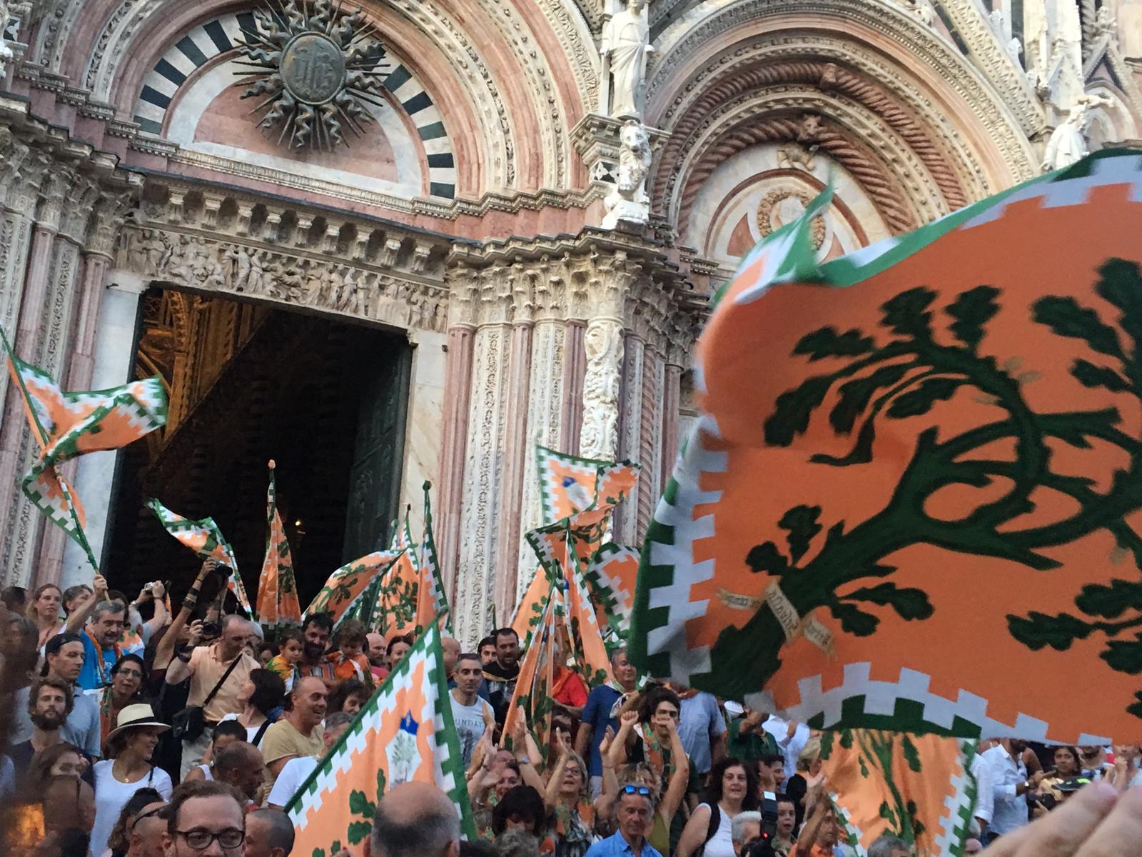 La corsa E’ stata una corsa mozzafiato e bellissima dopo una mossa lunga e nervosa. Prima della partenza il mossiere Bartolo Ambrosione ha chiamato le contrade fuori dai canapi ben otto volte e in più occasioni ha dovuto richiamare i fantini che si davano battaglia, su tutti quelli delle contrade rivali Oca e Torre. E’ stata l’Onda a prendere la testa della corsa alla partenza ma il Bruco, con una traiettoria interna, alla prima curva di San Martino è riuscita a guadagnare la prima posizione. Dalle retrovie la Selva è riuscita ad arrivare in seconda posizione e quando ha sferrato l’attacco alla seconda curva di San Martino è caduto Tittia. All’inizio del terzo giro l’incredibile rimonta del cavallo scosso Remorex, dalla quarta posizione una cavalcata memorabile sempre con traiettorie basse a sorpassare Onda e Aquila fino all’ultima curva del Casato con l’attacco all’esterno al Bruco in testa e la vittoria al fotofinish. Nelle retrovie da registrare la caduta alla seconda curva di San Martino, dopo quella di Tittia, anche del fantino del Drago Federico Arri detto Ares. La contrada della Selva torna dunque alla vittoria dopo quattro anni, l’ultima era stata nell’agosto 2015 sempre con il fantino Tittia, e conquista il suo 39/o trionfo sul tufo di Piazza del Campo