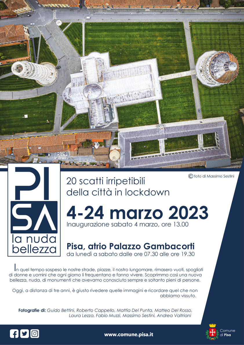 A tre anni di distanza dallo scoppio della pandemia da Covid-19, il Comune di Pisa ha voluto ricordare quei giorni con la mostra fotografica “Pisa. La nuda bellezza” (atrio di Palazzo Gambacorti, piazza XX Settembre. Da lunedì a sabato 07.30-19.30. Ingresso libero). La inaugurazione è in programma sabato 4 marzo (ore 13.00) alla presenza del sottosegretario all’informazione e all’editoria, Alberto Barachini, e del sindaco di Pisa, Michele Conti. La mostra sarà poi visitabile fino al 23 marzo.