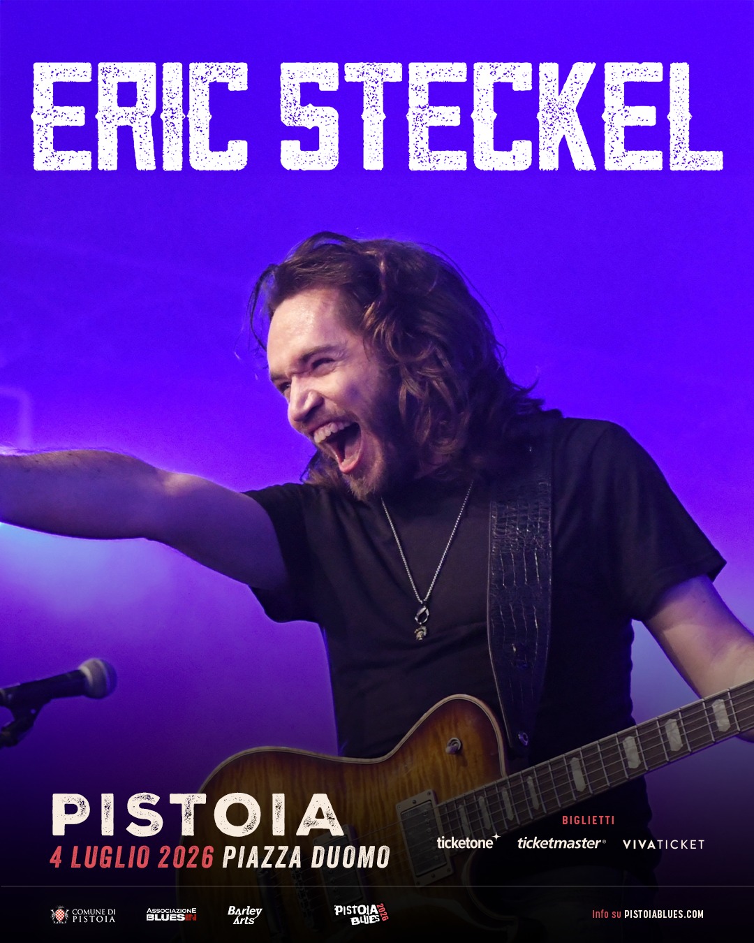 Eric Steckel. Il chitarrista e cantante statunitense, tra i più apprezzati del panorama blues-rock contemporaneo, sarà al festival per la seconda volta. Steckel porta sul palco del festival un live ad alta intensità, fatto di riff potenti, assoli incisivi e grande energia. Con una carriera internazionale fatta da centinaia di concerti in tutto il mondo, Steckel rappresenta una delle voci più autentiche e dinamiche del blues elettrico moderno.