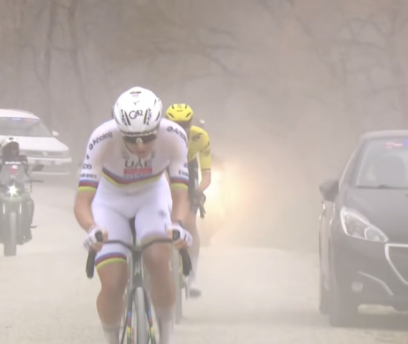 Alle sue spalle si è formato un gruppetto di inseguitori di lusso – Paul Seixas (il teenager francese esploso in questa stagione), Tom Pidcock (che già nel 2025 aveva provato a resistergli), Wout van Aert – ma la differenza si è vista subito. Chilometro dopo chilometro, il margine cresceva. La polvere bianca delle strade sterrate si alzava come una cortina, e dietro quel velo Pogačar diventava sempre più irraggiungibile.