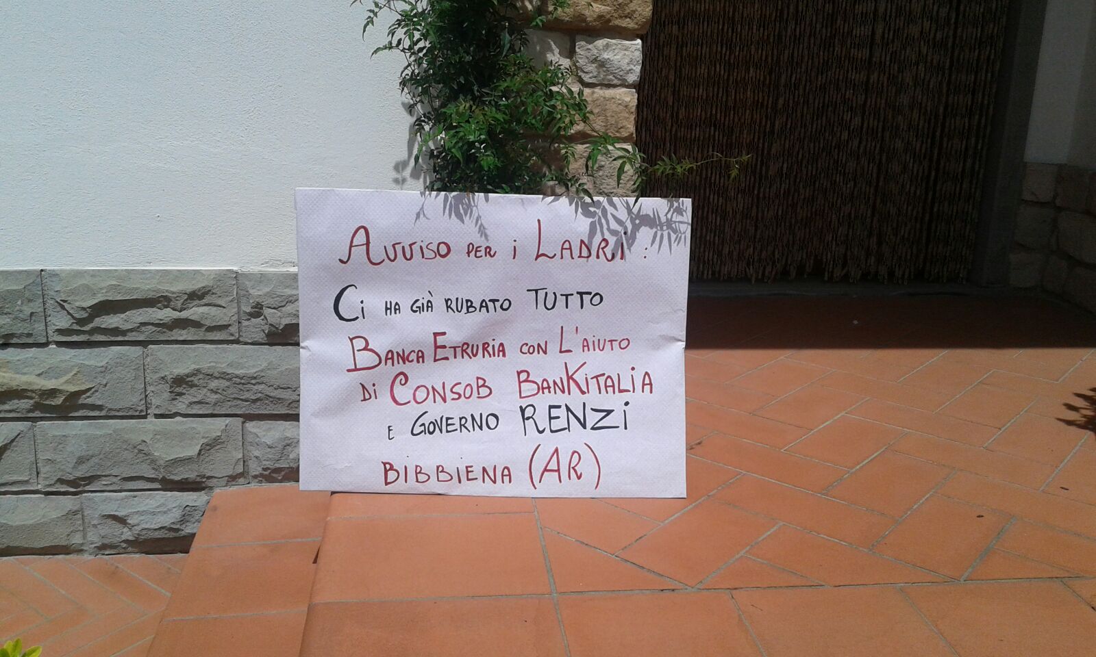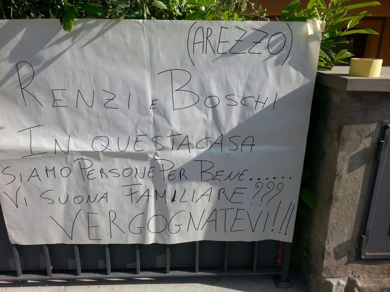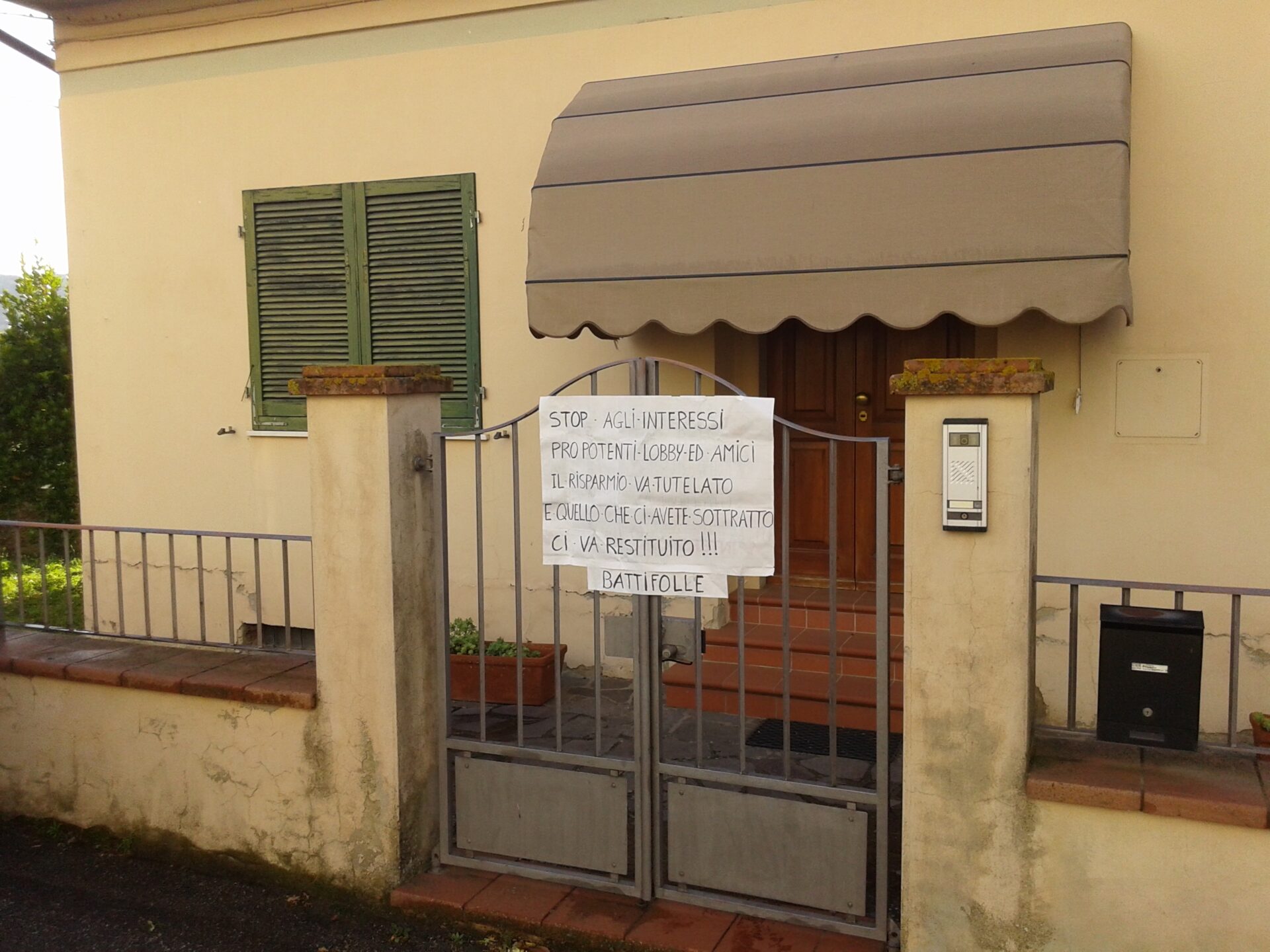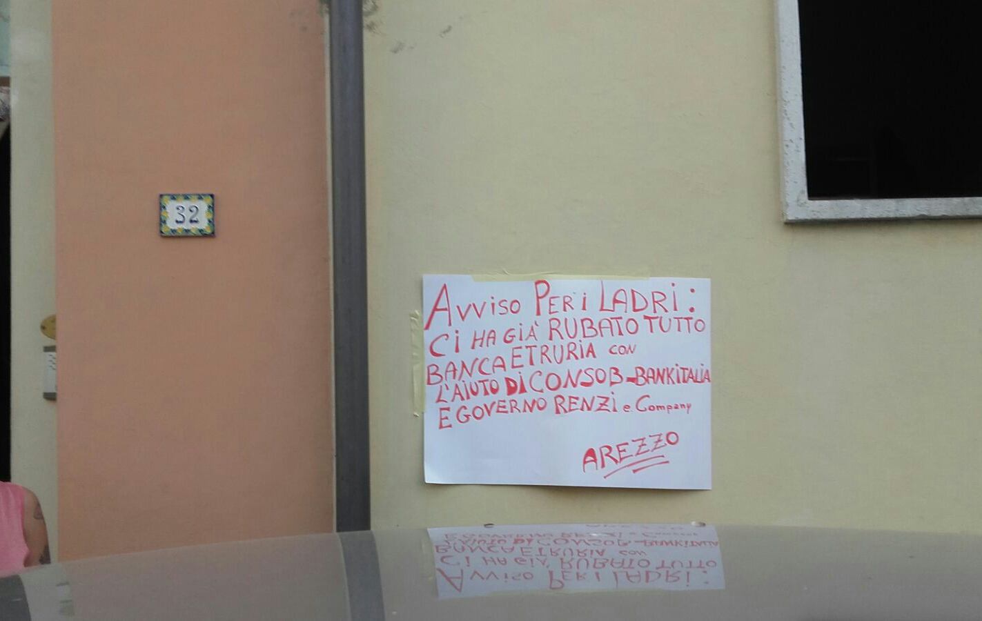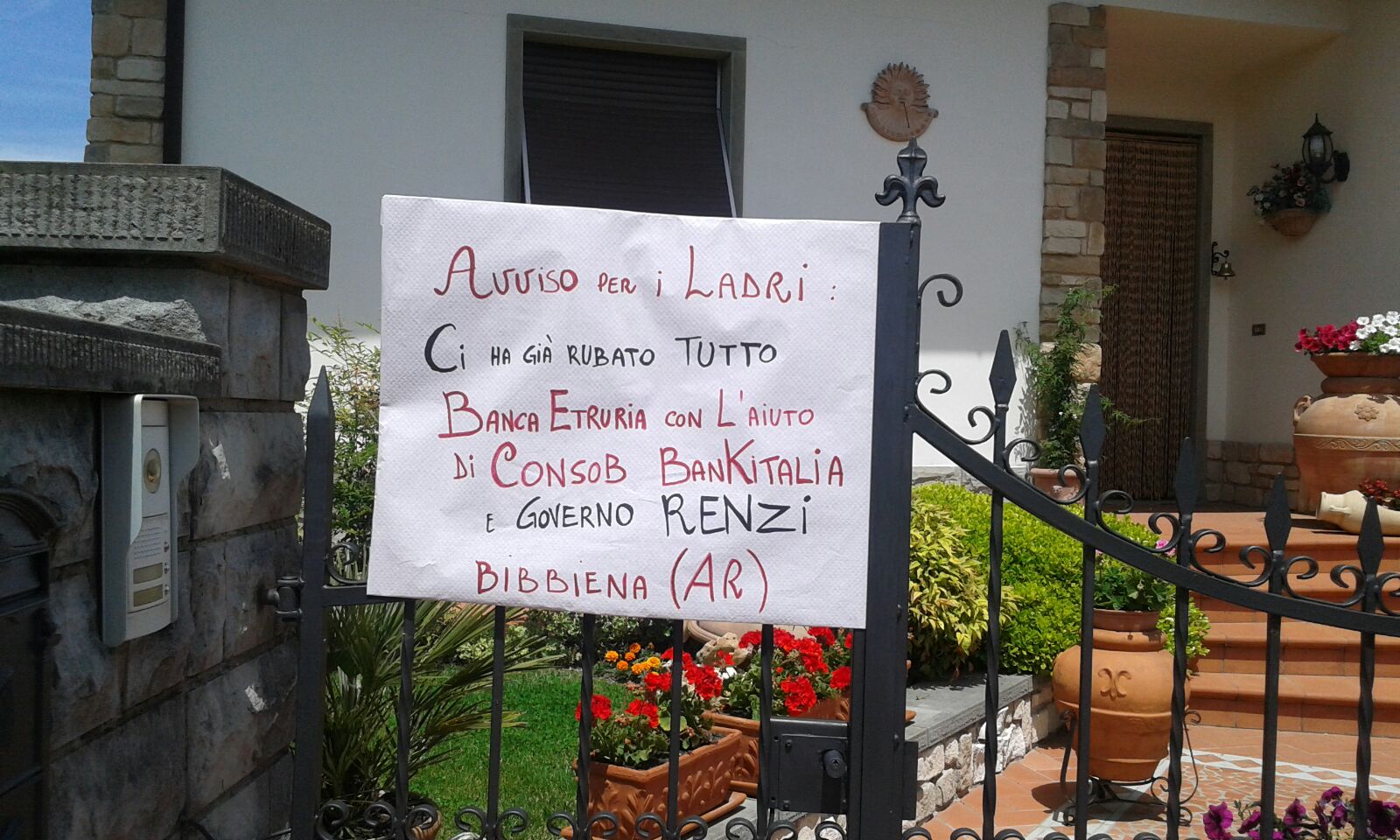 Da Empoli ad Arezzo, passando anche per Bologna e Chieti: affissi all’ingresso delle abitazioni poster di rabbia contro Renzi, Boschi e il decreto legge cosiddetto “salvabanche”. In ogni cancello, porta o portone un messaggio diverso. È la nuova forma di protesta, che prosegue, delle Vittime del Salvabanche. «Nell’attesa che il Senato voti la legge e gli emendamenti sui rimborsi gli obbligazionisti e gli azionisti azzerati nel crac delle quattro banche non si rassegnano – spiega l’associazione in una nota -, e manifestano ancora il loro disappunto con dei poster appesi fuori dalle loro abitazioni».