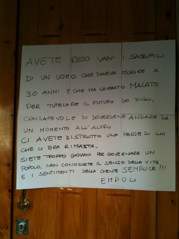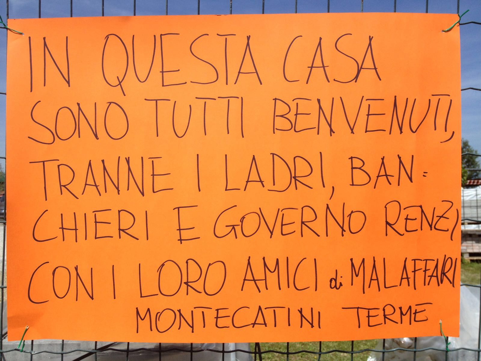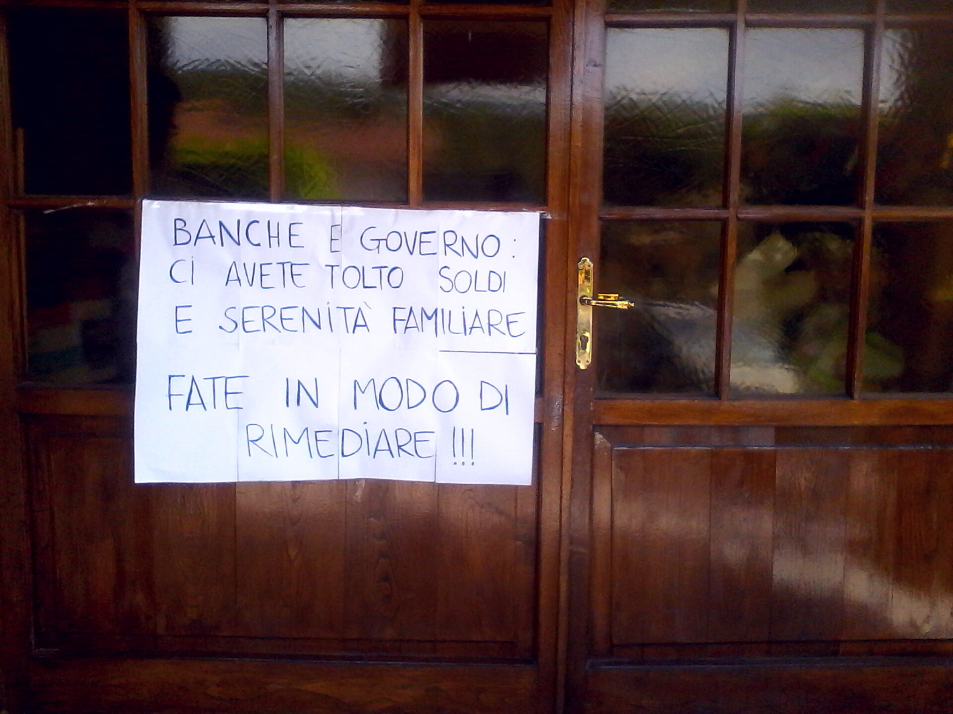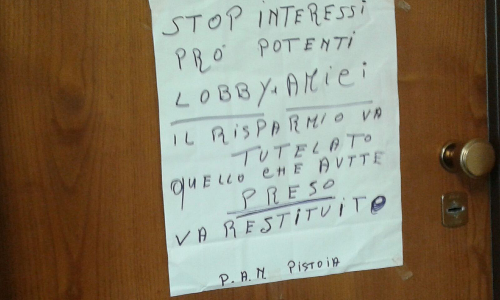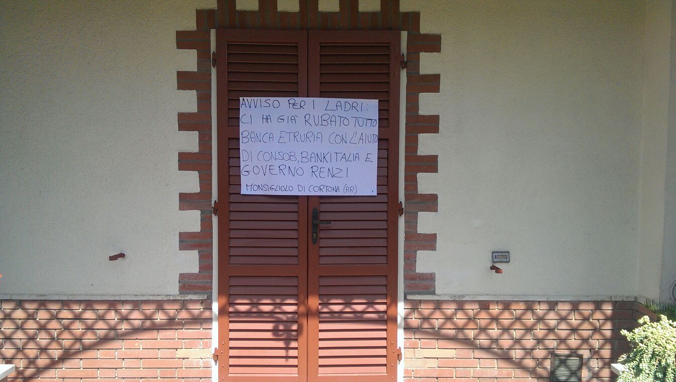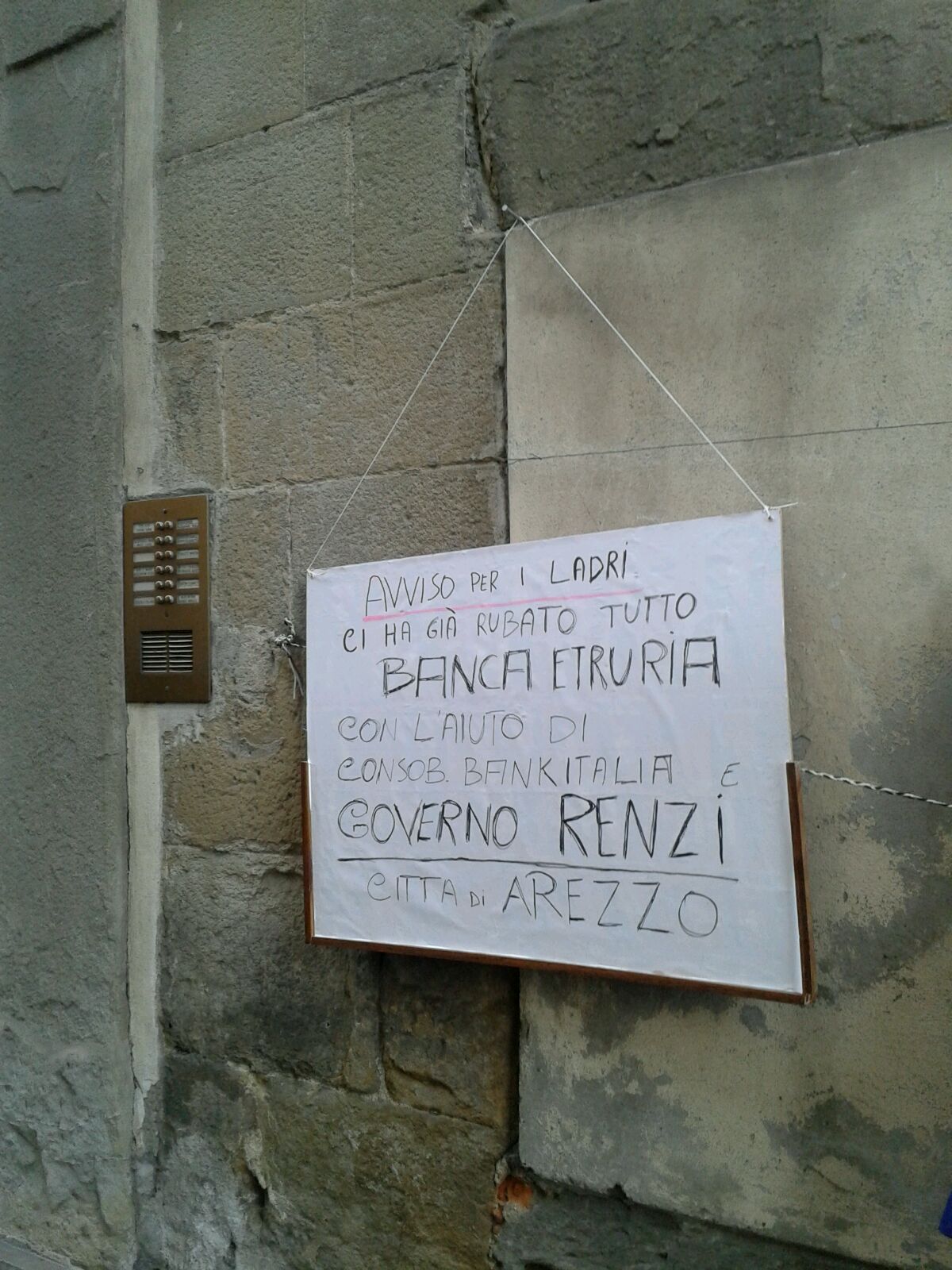 Da Empoli ad Arezzo, passando anche per Bologna e Chieti: affissi all’ingresso delle abitazioni poster di rabbia contro Renzi, Boschi e il decreto legge cosiddetto “salvabanche”. In ogni cancello, porta o portone un messaggio diverso. È la nuova forma di protesta, che prosegue, delle Vittime del Salvabanche. «Nell’attesa che il Senato voti la legge e gli emendamenti sui rimborsi gli obbligazionisti e gli azionisti azzerati nel crac delle quattro banche non si rassegnano – spiega l’associazione in una nota -, e manifestano ancora il loro disappunto con dei poster appesi fuori dalle loro abitazioni».