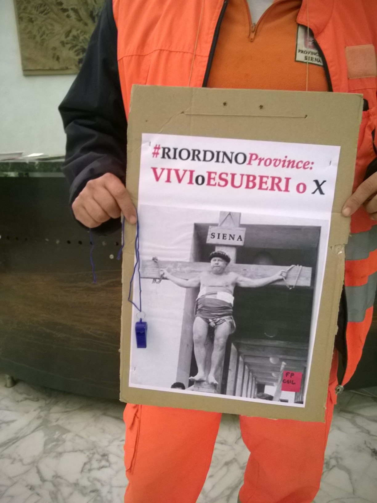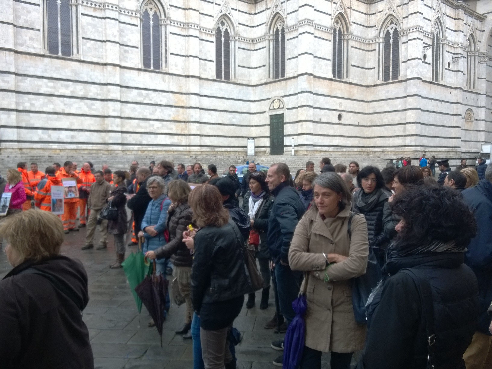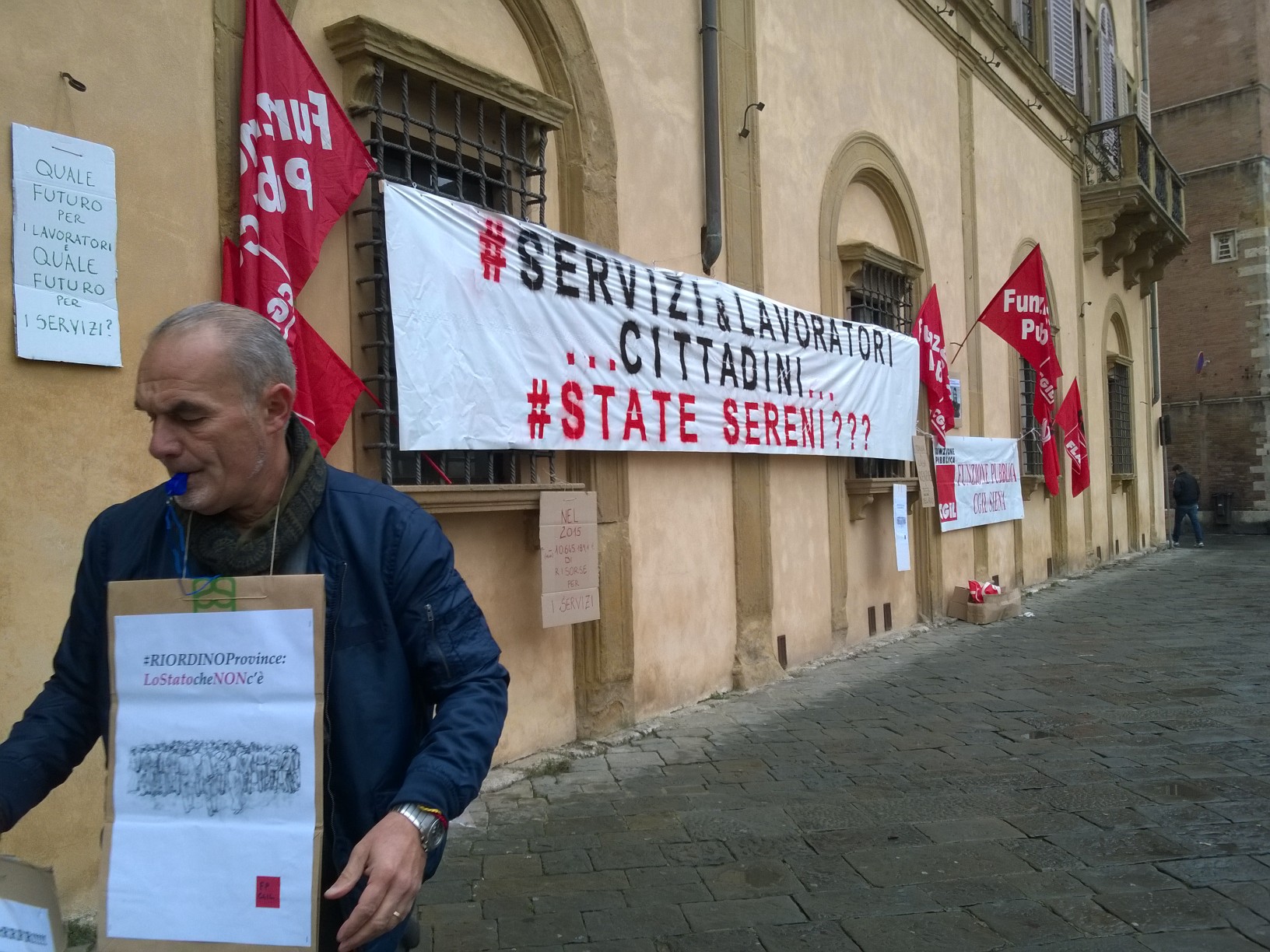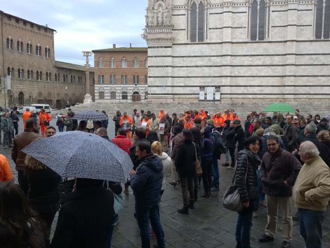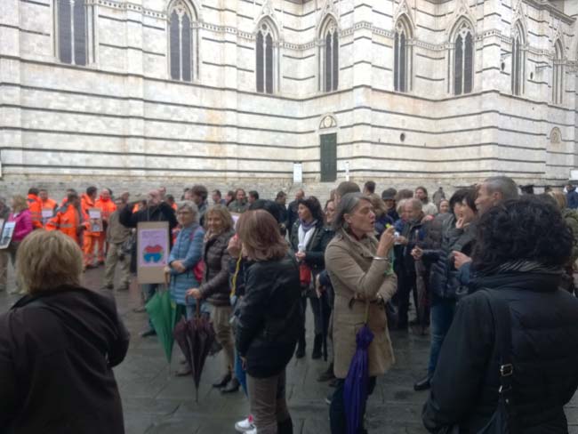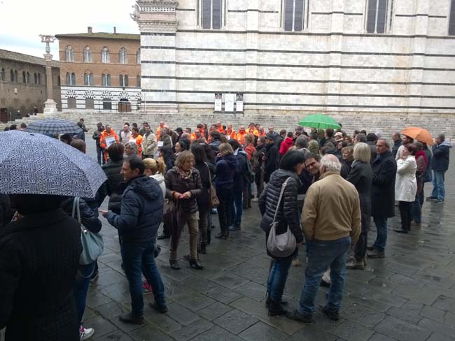Scendono in piazza i lavoratori dell’Amministrazione provinciale di Siena in un presidio-assemblea indetto sotto la Prefettura, ai piedi del Duomo senese. In una nota stampa la Flai Cgil di Siena ha spiegato i motivi dell’agitazione, confermata da slogan che inneggiano ad un futuro incerto dopo l’avvento della riforma Delrio: i «lavoratori sono preoccupati come tutti i colleghi dell’Amministrazione provinciale – spiega il sindacato – che i tagli mettano a serio rischio il loro futuro lavorativo e che si traducano in un ennesimo disservizio per i cittadini e in un’ulteriore smobilitazione di risorse dal territorio».