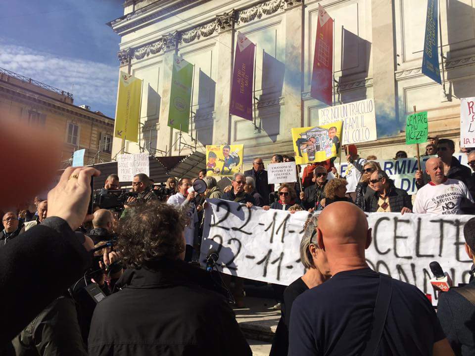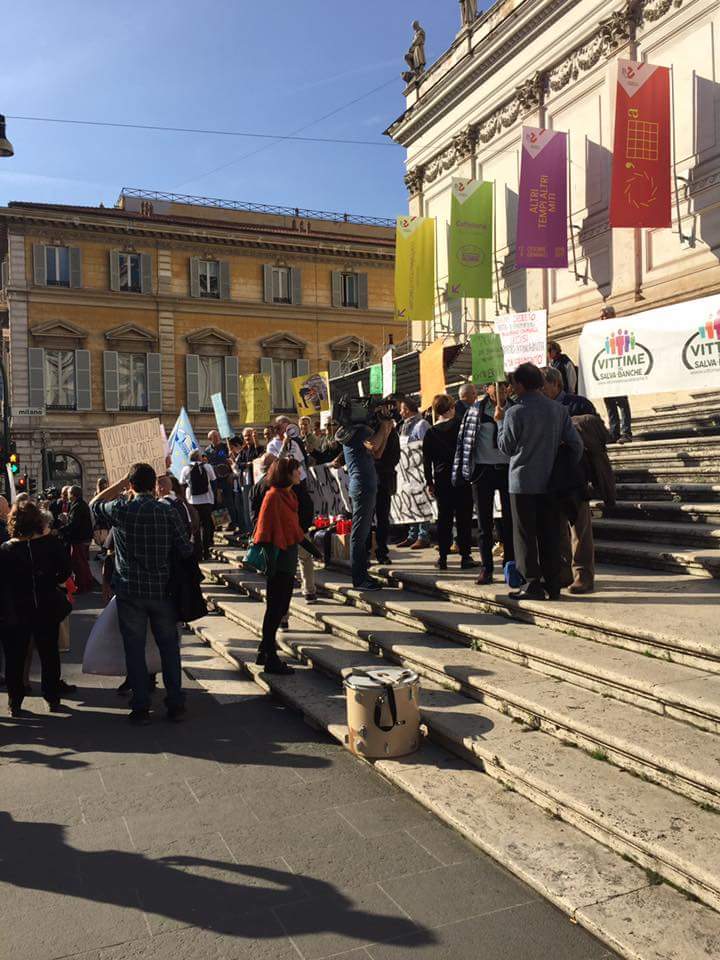 funerali-risparmio6Rimborsi? Quasi a zero Un grido che i risparmiatori dell’Associazione Vittime del Salva-Banche hanno lanciato a Roma per l’anniversario dell’uscita del decreto. Dopo aver manifestato in corteo nel cuore di Roma sono arrivati davanti a Banca d’Italia dove hanno depositato una bara di cartone con tanto di ceri da cimitero, in una macabra rappresentazione de “La Morte del Risparmio”. «Abbiamo manifestato e ribadito le nostre ragioni davanti a Banca d’Italia – dichiara Letizia Giorgianni -. Insieme a noi c’erano i rappresentanti di diverse forze politiche: Gasparri, Brunetta, Donzelli e gli esponenti 5 stelle. Con l’aiuto della Digos, che ha chiuso un occhio, abbiamo fatto anche un fuori programma arrivando fino al Quirinale. Oggi pomeriggio avremmo dovuto incontrare Visco in Banca d’Italia, ma ha mandato il suo vice Trequattrini. Come sempre si sono detti favorevoli alla nostra posizione e insieme abbiamo parlato delle nostre preoccupazioni». «Sono due le questioni che ci premono di più – spiega Giorgianni -. Recuperare i nostri risparmi e la vendita delle banche salvate che tarda ad arrivare. Il Decreto sugli arbitrati non è mai arrivato, e il rimborso parziale (fino a un massimo dell’80% per chi ha un reddito familiare al di sotto dei 35mila euro) è partito tardissimo e riguarda una minuscola parte dei risparmiatori. Su 130mila risparmiatori possono accedervi solo 4 mila. Le pratiche sono lentissime e su quasi tredicimila subordinati solo seicento sono stati liquidati con l’80%. Tra un mese scade la possibilità di fare ricorso. Con questo sistema non verrà risarcito nemmeno il 5% di noi. Banca d’Italia ci ha promesso un altro incontro tecnico. Paleremo della possibilità di destinare i guadagni relativi alla cessione della bad bank al rimborso dei risparmiatori esclusi dagli aventi diritto al ristoro parziale. Non c’è nessuna normativa europea che lo impedisca».