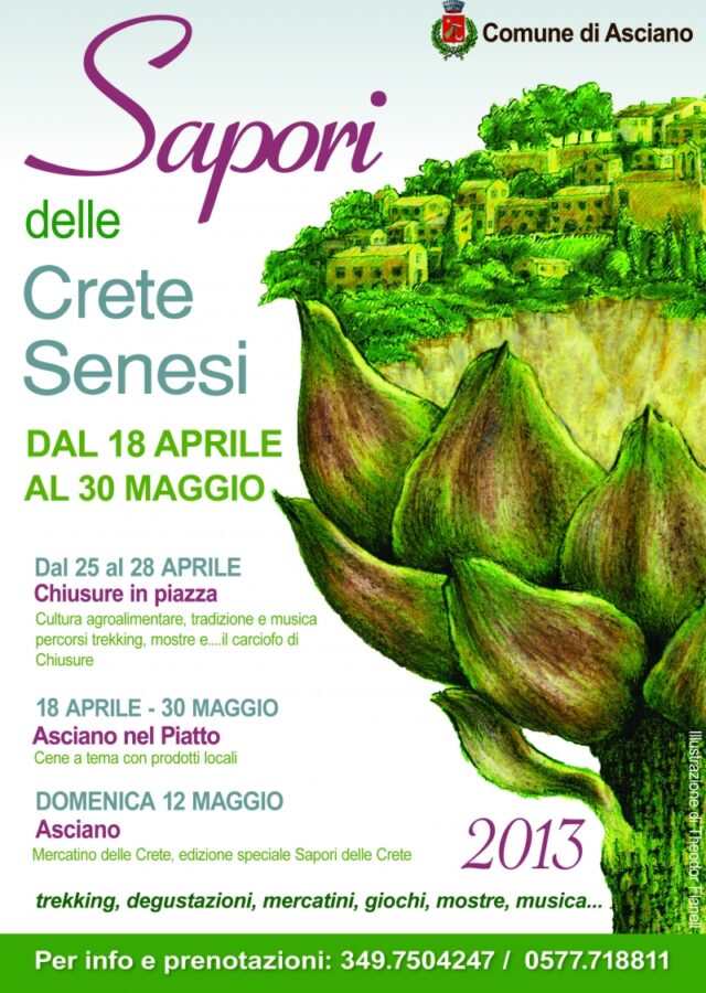 Chiusure in Piazza –“Sapori delle Crete” prenderà ufficialmente il via giovedì 25 aprile con “Chiusure in Piazza” per celebrare tutto il gusto, la tradizione e la cultura racchiusi nel rinomato Carciofo di Chiusure. Fino a domenica 28 aprile l’associazione “Il Castello di Chiusure” apre lo stand gastronomico ed il mercatino di prodotti agroalimentari dove sarà possibile gustare il tradizionale carciofo di questo piccolo borgo che si erge tra calanchi e biancane. Giochi, mostre, trekking, poesia e musica in strada faranno poi da cornice fino a sera alla manifestazione giunta quest’anno all’undicesima edizione.