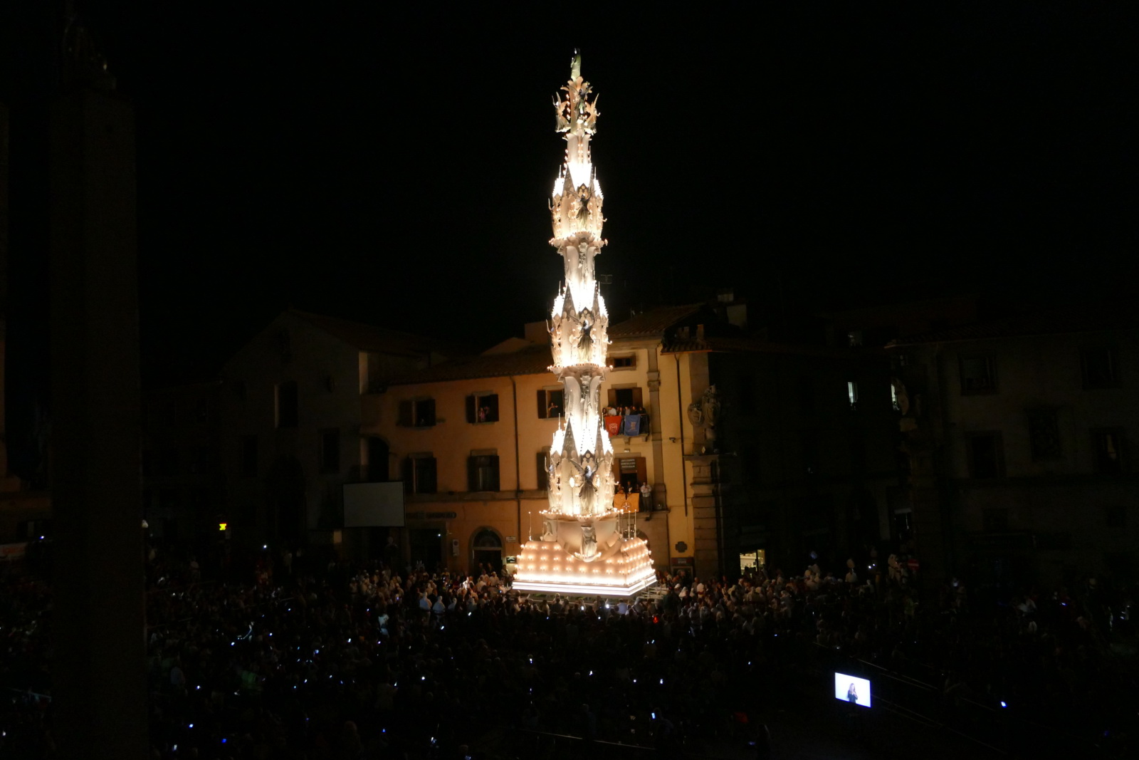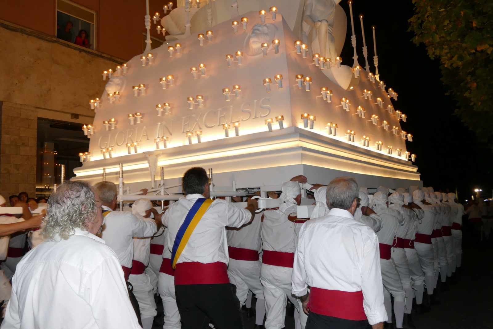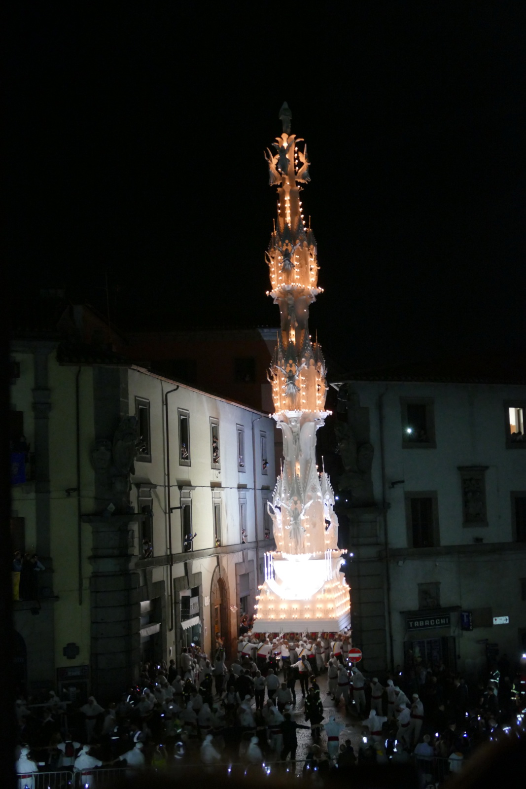 «Ciuffi di Santa Rosa, accapezzate il ciuffo», «Semo tutti d’un sentimento?», «Facchini di Santa Rosa, sotto col ciuffo e fermi…Sollevate e fermi» «Per Santa Rosa, avanti!…Posate piano, adagio…». Sono parole che ai più possono suonare ormai familiari, sono le parole che il capo facchino della Macchina di Santa Rosa ha pronunciato anche ieri a Viterbo come accade ormai dal 1258 anno della traslazione della Santa patrona dalla Chiesa di S. Maria in Poggio al Santuario a lei dedicato. I tempi della festa, della processione in cui la fatica umana si sublima nel massimo sforzo di elevare gli animi al cielo. Quel cielo scuro, quasi nero che nel percorso di oltre un chilometro viene illuminato solo dalla Macchina che oggi assume la forma di una torre animata da fiaccole e luci. Circa trenta metri di altezza per un perso di 51 quintali che culmina con la statua della Santa. La sera del 3 settembre di ogni anno, a Viterbo, la macchina viene sollevata e portata in processione a spalle da un centinaio di uomini i “Facchini di Santa Rosa” tra le vie, talvolta molto strette e le piazze del centro cittadino. Fino all’ultimo tratto tutto in salita che, nel massimo sforzo, viene effettuato quasi a passo di corsa, con l’aiuto di corde in aggiunta e di travi dette “leve” che spingono la Macchina posteriormente. L’ultimo sforzo prima che la Macchina con la Santa venga messa a “riposare” davanti al Santuario dove rimane in adorazione per alcuni giorni.