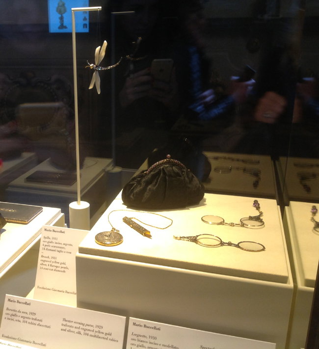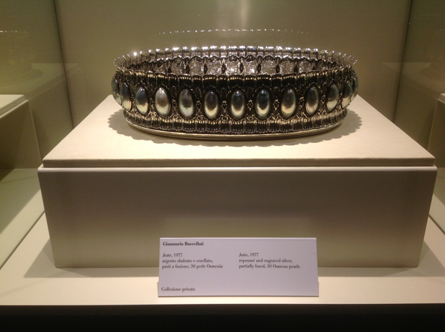 Rarità medicee tra i gioielli esposti In mostra oltre 100 opere, tra gioielli, lavori di oreficeria e di argenteria, creazioni che vanno dal 1910 ad oggi, che rifulgono nelle teche in mezzo alle rarità delle collezioni medicee in un confronto che ha pieno motivo d’essere. E per più di una ragione: sia perchè Firenze è una delle città simbolo per la nascita dell’arte orafa, come ci ricordano i nomi di Lorenzo Ghiberti e Benvenuto Cellini, sia perchè fu proprio visitando nel 1968 il Museo degli Argenti che nacque in Gianmaria la voglia di cimentarsi con il ‘tesoro’ della famiglia Medici, dai celebri vasi in pietre dure di Lorenzo il Magnifico agli elaborati gioielli dell’Elettrice Palatina. Così prese il via la creazione degli “Oggetti preziosi” – come lui stesso li definisce – coppe, vasi, scatole, tutti pezzi unici che appartengono alla sua collezione personale. Primo fra questi lo “Scrigno mediceo” del 1970, prezioso manufatto di forma decagonale che riprende motivi classici e canoni architettonici rinascimentali. E poi il “Cratere delle Muse” del 1981, una coppa di giada tempestata con oltre 2000 zaffiri cabochon che ricorda il “bugnato” dei palazzi fiorentini; la “Coppa Smithsonian” in agata, oro e argento, in prestito dallo Smithsonian Institution di Washington DC, iniziata nel 1976 e completata nel 2000, solo dopo aver raggiunto quella che Gianmaria chiama «l’armonia indispensabile a ogni forma di bellezza». Recentissima è poi la “Coppa Florentia”, un omaggio di Buccellati alla città di Firenze realizzato in cristallo di rocca, oro giallo e oltre 2000 pietre preziose sfaccettate.