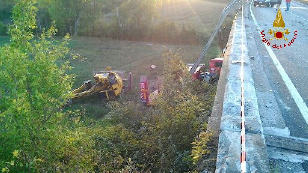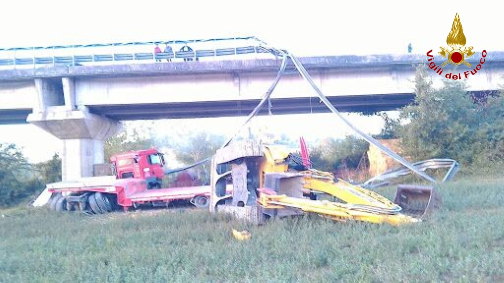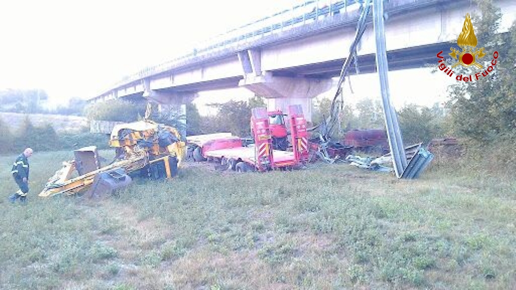 Spettacolare incidente questa mattina a Siena intorno alle 6,30 dove, sulla tangenziale che collega la Siena-Grosseto alla Siena-Bettolle, un camion che trasportava un escavatore si è scontrato con un’auto ed è finito sul guard-rail, sfondandolo e precipitando in un campo sottostante. Il mezzo ha fatto un volo di 15 metri e il conducente è stato sbalzato a 5 metri di distanza dal camion. All’arrivo dei Vigili del Fuoco l’uomo era cosciente ed è stato subito affidato alle cure del personale del 118, intervenuto sul posto insieme ai Carabinieri. Anche la conducente dell’auto è stata soccorsa dai sanitari. Forti ripercussioni sul traffico rimasto bloccato per almeno un’ora e mezzo durante le operazioni di soccorso e ripristino della viabilità.